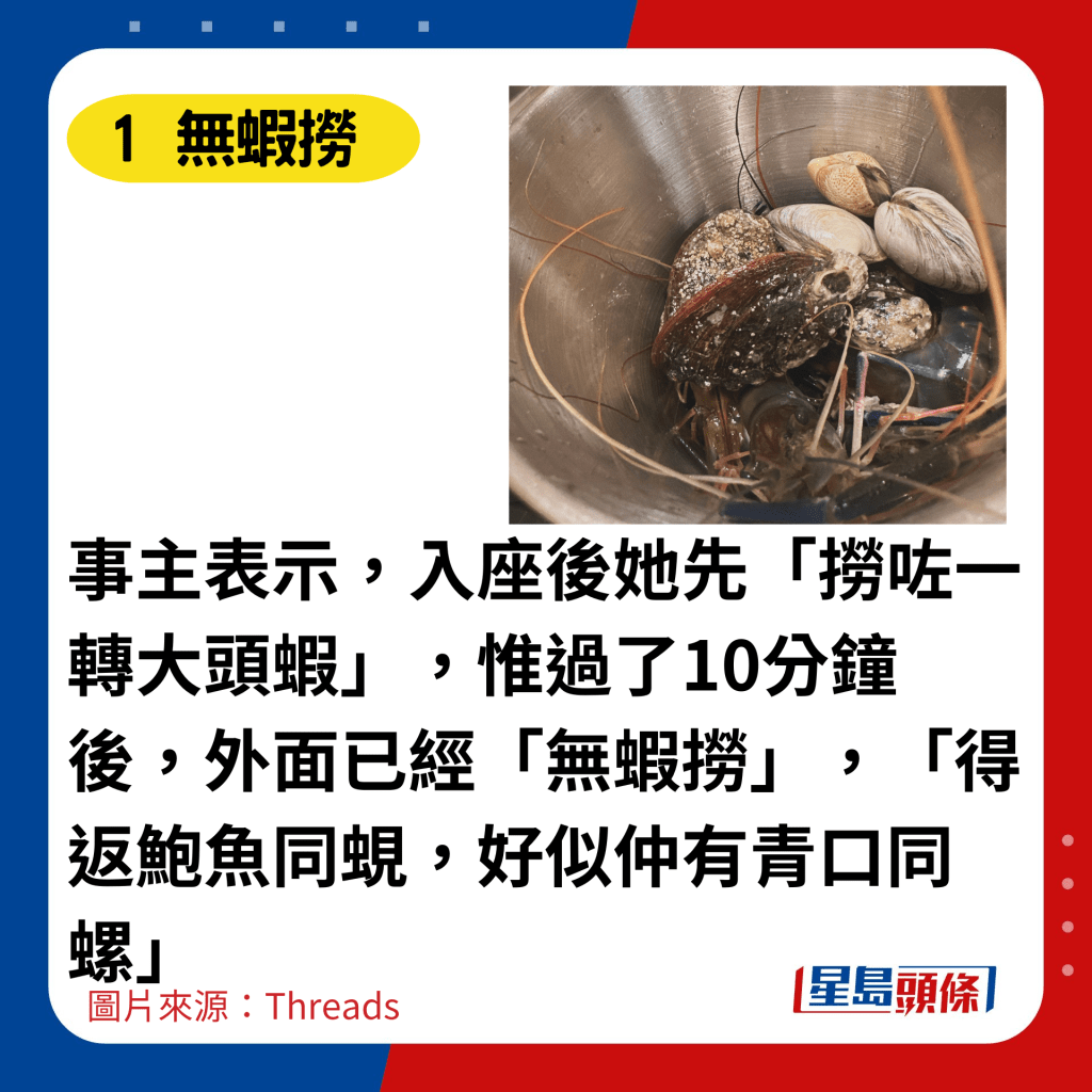近日,有网民在Threads上发文,批评位于荃湾的千海水产海鲜火锅放题服务态度恶劣。事主表示,自己光顾的是限时2小时的即捞海鲜火锅放题。她于晚上9时入座,惟时限未到,就有店员因“赶收工”而催促事主“食快啲”。事主其后列出4宗罪,怒轰餐厅“服务极度差”,更表明以后“唔会再去”。