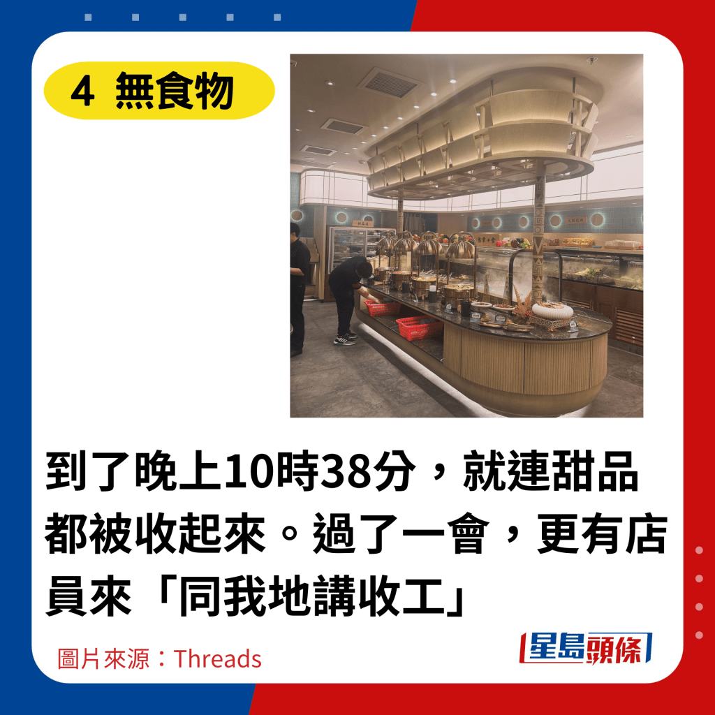 《星岛》记者就网民投诉致电千海水产海鲜火锅放题负责人了解,获回覆指事主到场当日为试业首两天,承认海鲜货源不足,“死口”较多,惟餐厅坚持要提供最新鲜的海鲜给客人,所以大头虾在约9时多便未及补货。另外,自助区部分食物的确会在关店前,提早15分钟收起以准备清洁,店员亦会在事前知会客人。