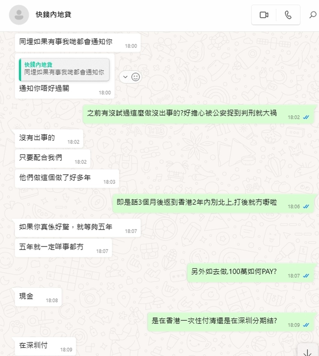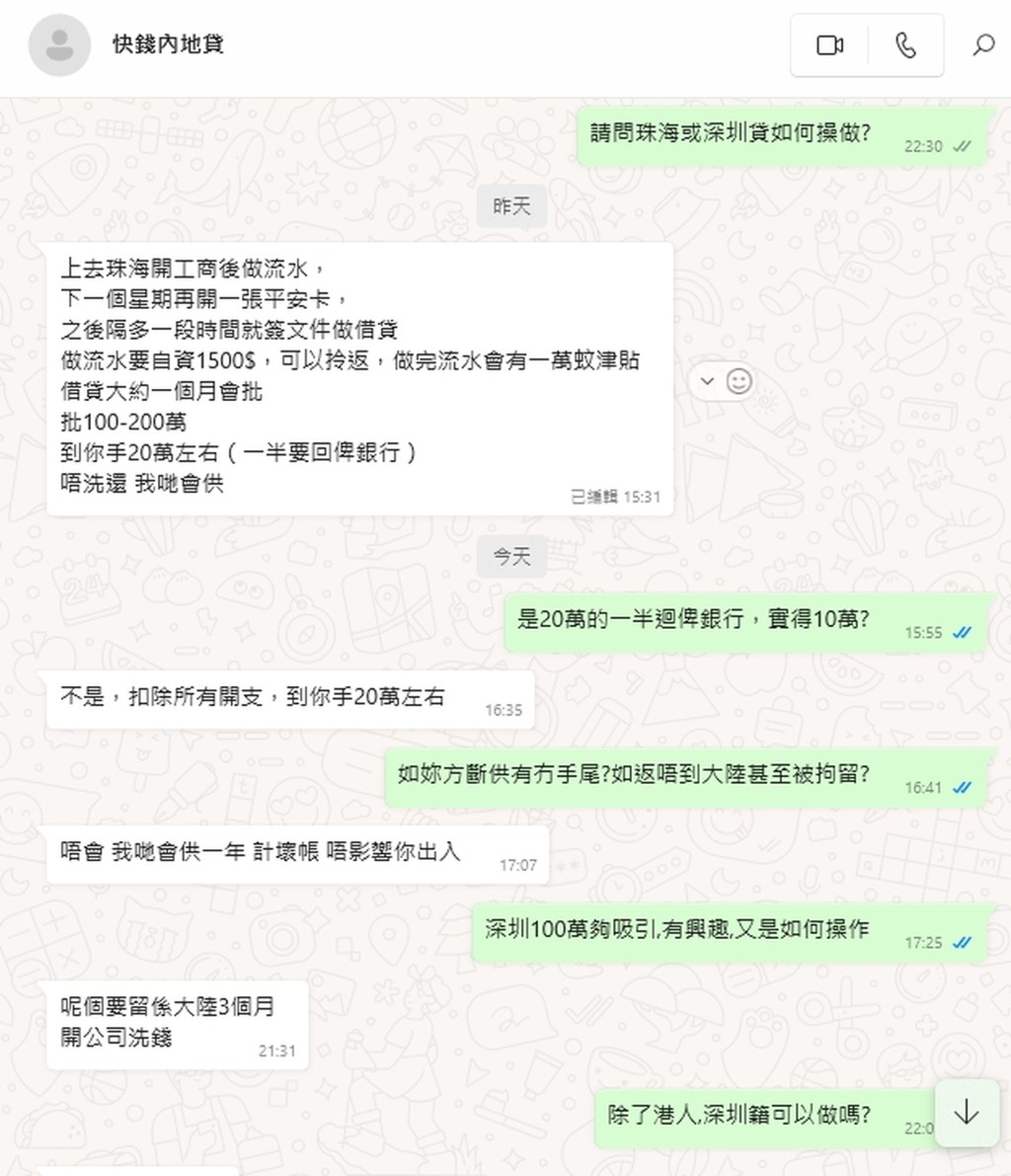 “深圳内地公司,3个月(需长驻、包食宿),到手金额100万,每月生活费2万,事后2年不得返去(内地)……”报酬丰厚的“北上发财”广告近日充斥社交平台,相信是为了利诱港人从事不法勾当,记者遂通过WhatsApp联系一名自称姓黄的发文者,获告知是协助其老板洗钱。