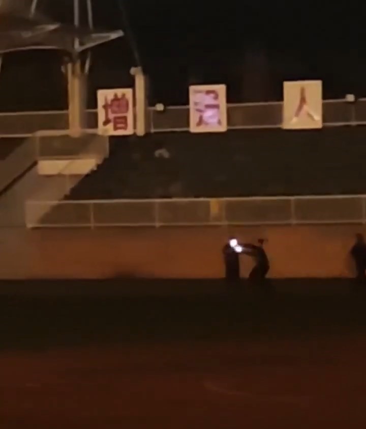 网上其中一条影片见凶手在一个疑似操场位置,遭多名制服人员包围。凶手当时并未有太大反应,惟之后手持物体靠近颈部,一名人员即扑上,其余人员亦上前协助。