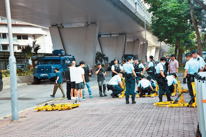 ▲多名穿上战术背心的警员于法院对开行人路增设铁栏和防止车辆冲击的设备。