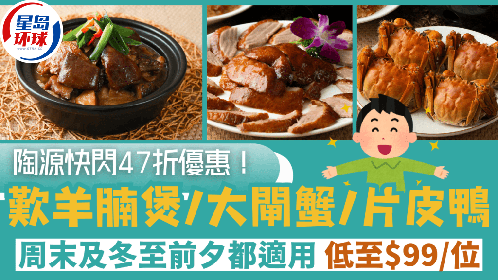 陶源海鲜酒家推出羊腩煲套餐优惠,低至47折! 今日(11月18日)下午3时起透过KKday预订陶源海鲜酒家的“冬日暖羊羊四人餐”,可以47折享用吃古法羊腩煲、蟹粉扒豆苗、清蒸大闸蟹或京式片皮鸭、生炒糯米饭等,低至每位$99,周末或冬至前夕亦适用,即睇陶源海鲜酒家优惠详情!