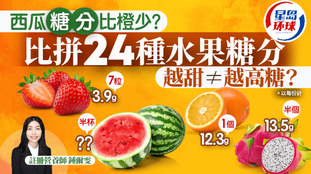 注册营养师钟尔雯指,很多人以为水果越甜代表糖分越高,其实不一定。她指,水果的甜味来自果糖、葡萄糖和蔗糖的比例,其中果糖甜度最高,但不代表糖分多,例如西瓜、火龙果和哈密瓜虽然甜,但每100克的糖分其实少于橙,所以,甜度不可以准确反映糖分含量。