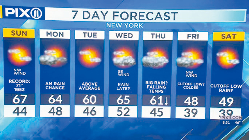 ▲预计20日晚到21日,大雨和强风将袭击纽约和新泽西都市区,气温将降至40多度(华摄氏度,下同)。 电视截图