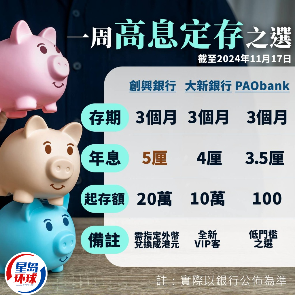 【定存攻略】美国息口前景转趋不明朗,虽然上周公布的美国10月CPI数据符合预期,令12月减息预期持续,但市场忧虑特朗普上任后会推出减税及加大关税等政策,长远将引致通胀升温而令联储局明年放慢减息步伐。另一方面,政府推出基础建设零售债券,保证息率不少于3.5厘,可能抢走部份定存客源;不过,香港银行港元3个月定存仍不乏3.5厘至4厘选择,最高更达5厘,惟存户需留意特定条款限制。