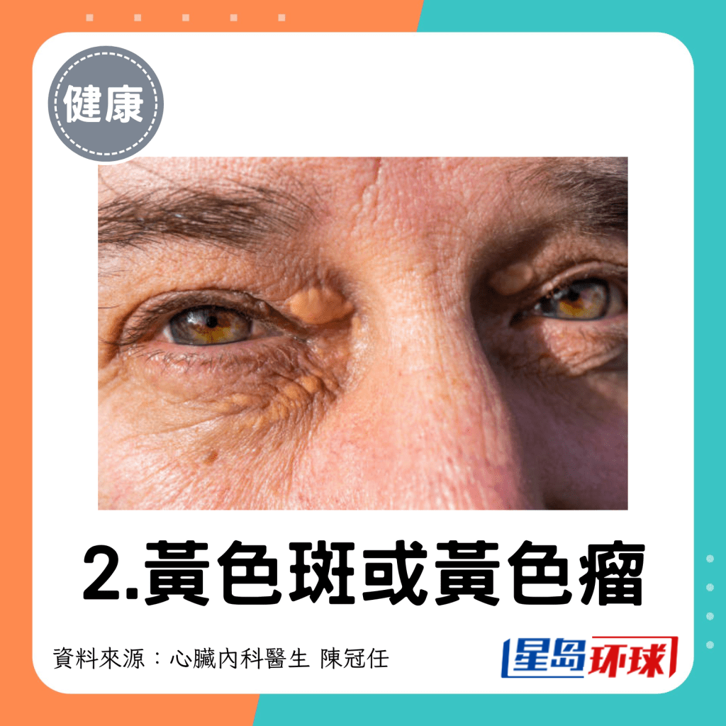 心脏内科医生陈冠任在节目《健康云之道》指,一般胆固醇过高的高血脂患者也无明显疼痛不适症状,往往要抽血检查才可确诊,但此时通常已延误诊断。惟他指出,也可从肉眼分辨胆固醇是否超标,当外观出现以下征兆时则要特别留意。