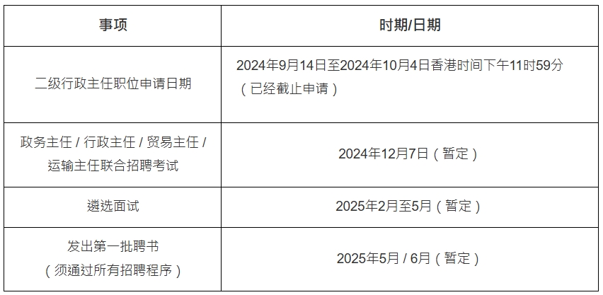 翌年2月至3月会举行首轮面试;3月至4月会举行最后面试;6月至7月会发出首批聘书(视乎所有招聘程序是否已经完成); 最后在7月至8月,首批新聘任政务主任入职。 以上资料只供参考。 所有事项的实际举行时间及细节,请参阅当时的公布。
