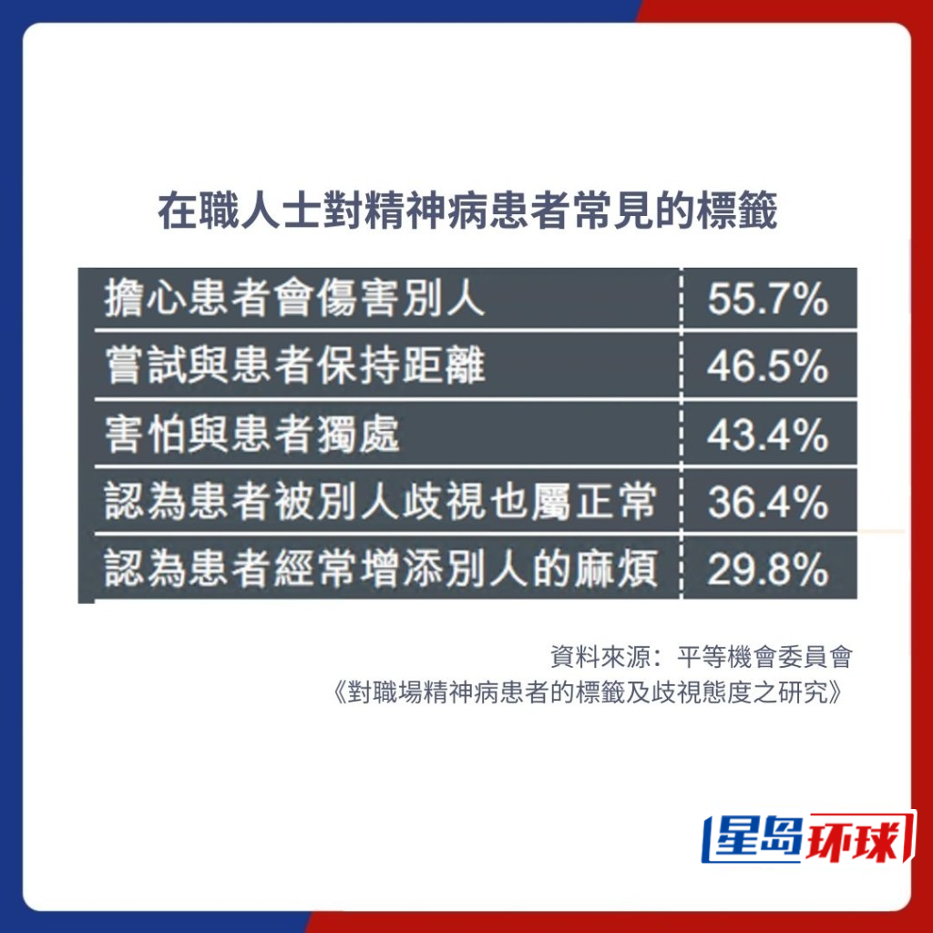事实上,平等机会委员会曾委托香港教育大学心理学系进行研究,在2020年以问卷形式,访问593名在职工作人士及265名精神病患者,发现分别有超过30%的精神病患者表示在求职、在职及离职过程中经历歧视。此外,91.9%受访在职人士知道香港的《残疾歧视条例》,惟对精神病患者仍有常见标签;55.7%的人担心精神病患者会伤害他⼈,另有46.5%会尝试与他们保持距离。
