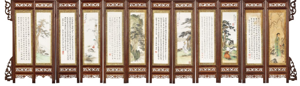 ▲十二屏风,集合张伯英、溥儒、傅增湘、寿鑈、溥伒、颜伯龙、马晋、张海若、樊虚、卓君庸、陈缘督、沉凤翔书画,难得的合璧。(估价40至50万港元)