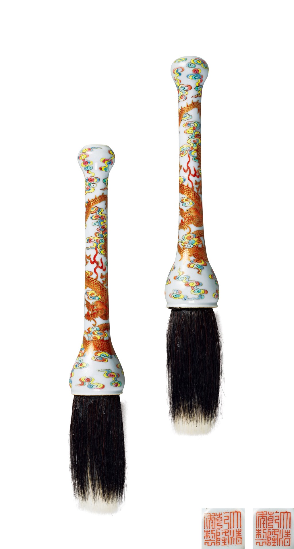 ▲清乾隆御制洋彩描金云龙纹笔一对,款识:“大清乾隆年制”六字三行篆书款。(估价260至300万港元)