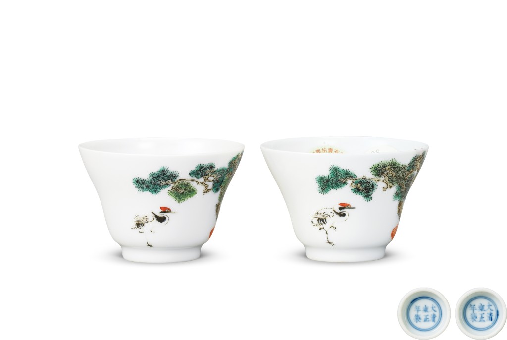 ▲清雍正粉彩松鹤延年图折腰小杯一对,颇有清中期宫廷山水画之神韵。(估价120至150万港元)