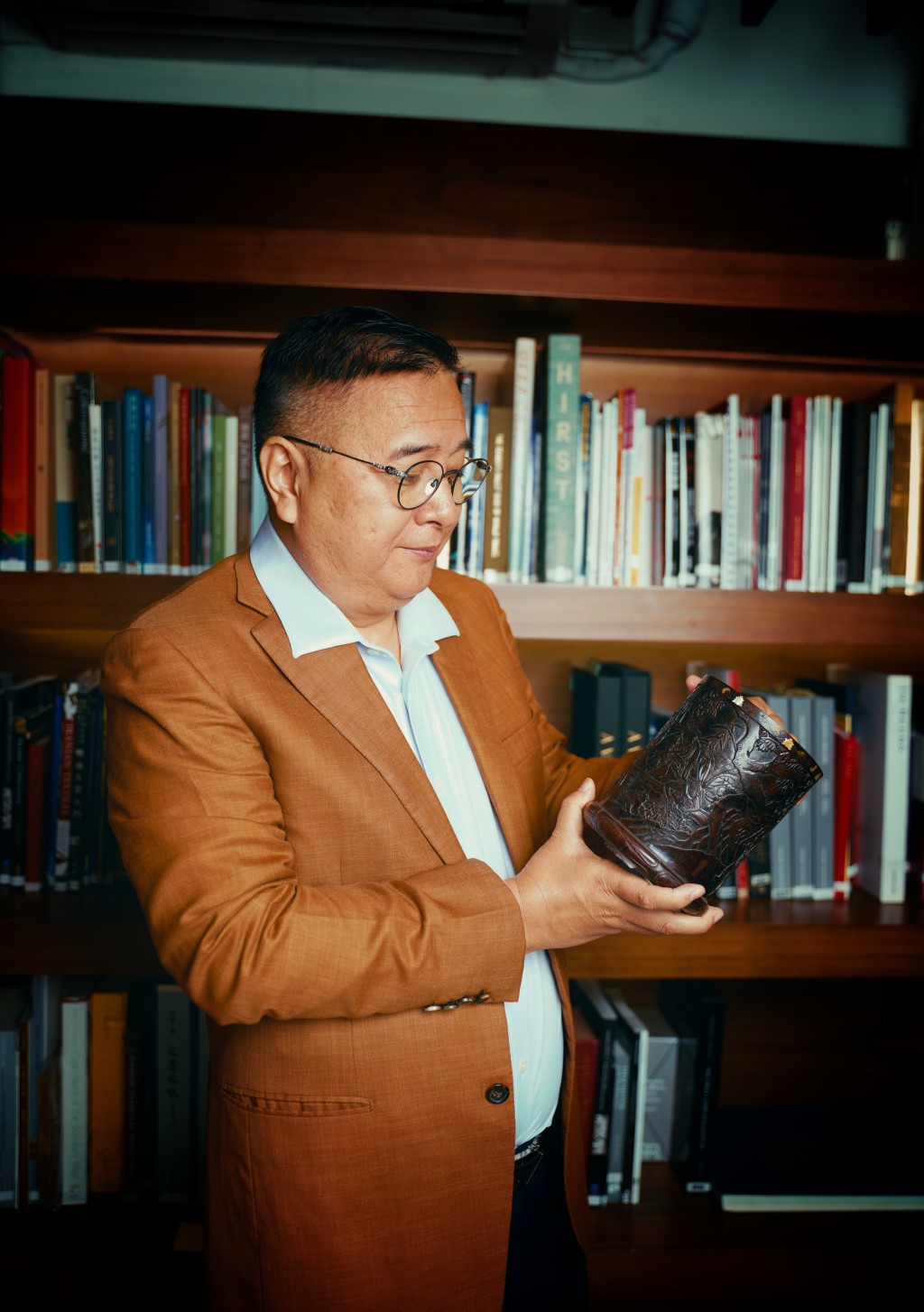 ▲薛世清由藏家、行家到拍卖行当家,见尽收藏圈有趣事,他手上把玩的是“明紫檀嵌宝渔家乐图笔筒”,估价150万至180万港元。