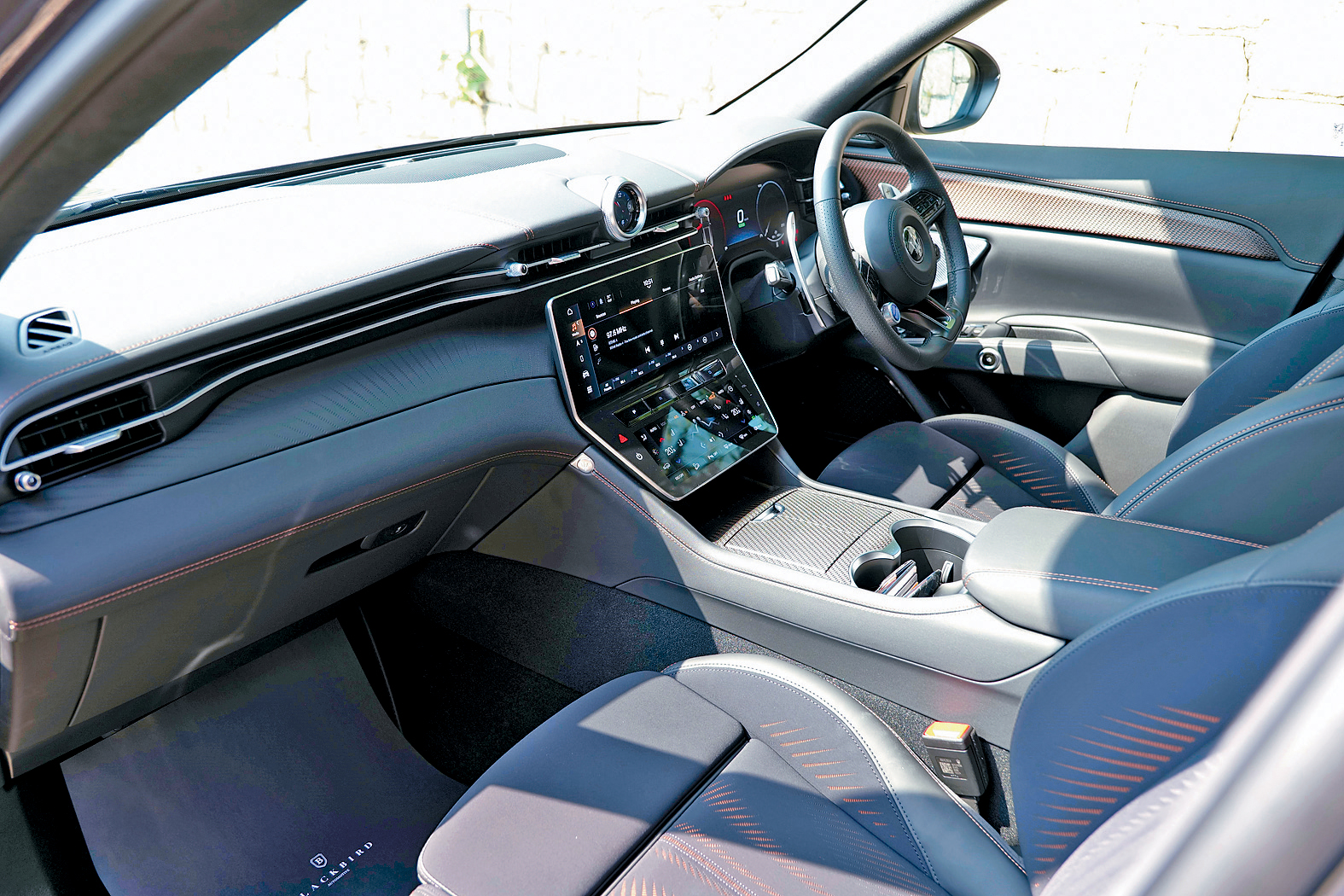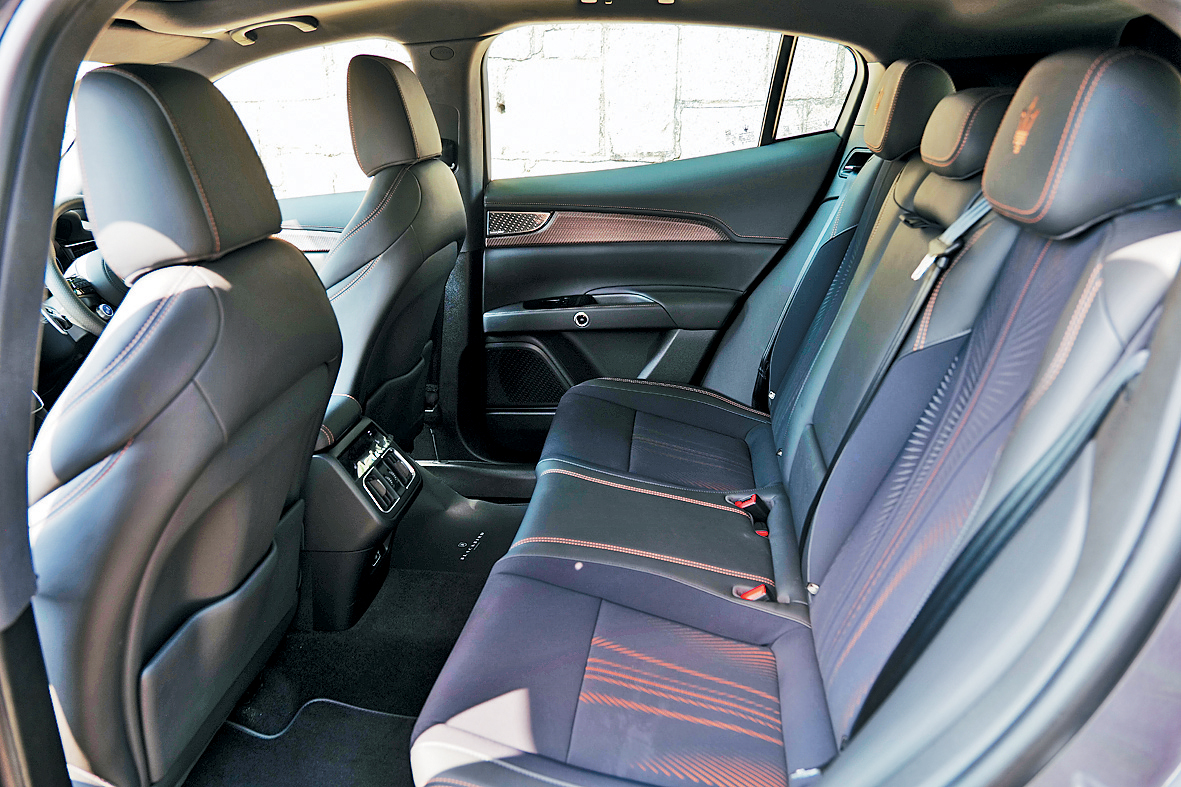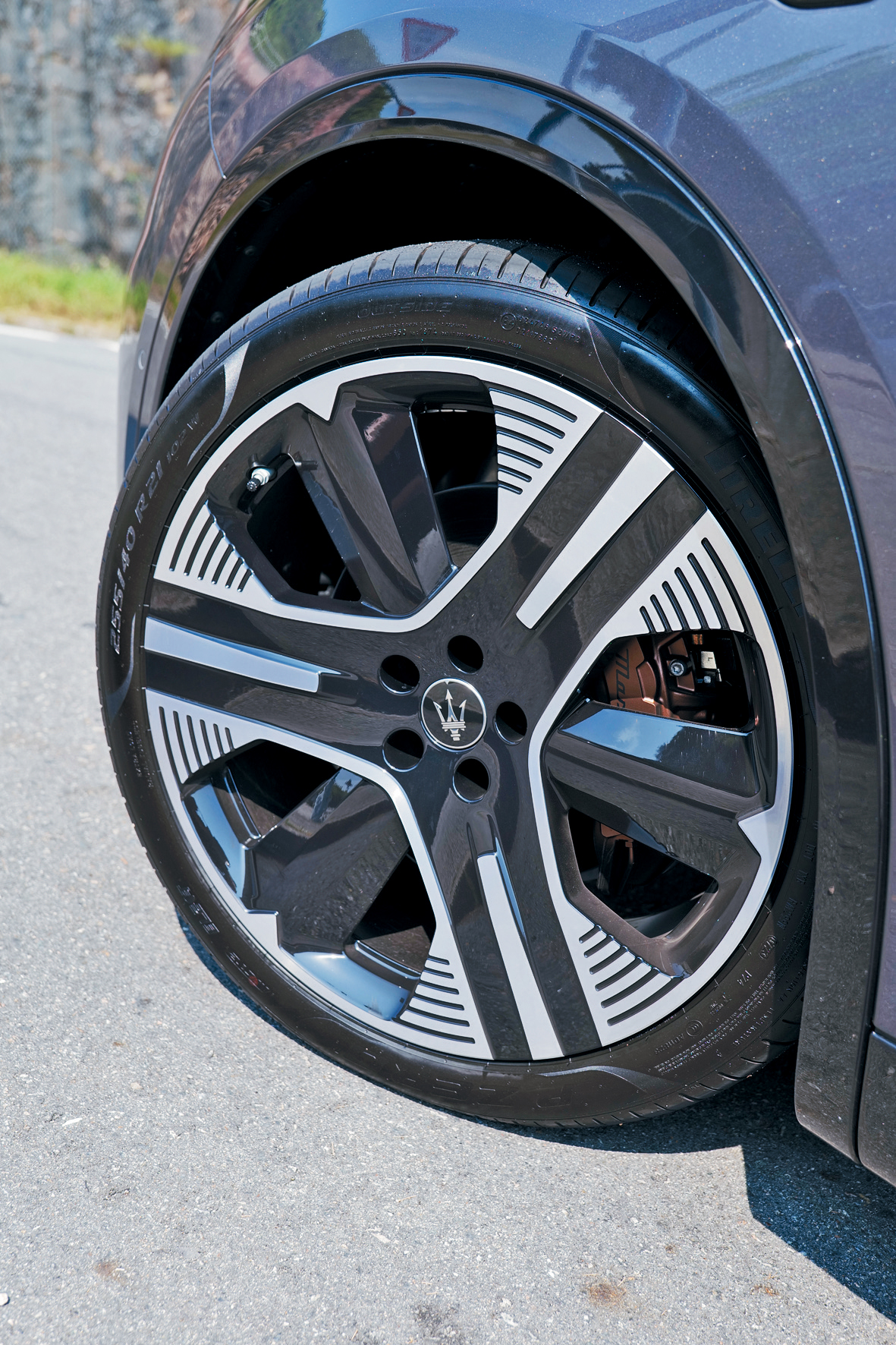 Grecale Folgore跟汽油版应用相同FCA Giorgio底盘,不过改配400V电力架构,包括105kWh锂电及前后马达(各输出205kW)四驱,总输出550ps马力及820Nm扭力,WLTP续航力500km,并支援DC 150kW快速充电(20%充至80%约30分钟)。Folgore电动版外观不同汽油版在于专用鬼面罩、轮圈及Folgore徽章等。车厢及座椅以崭新Econyl再生尼龙纤维物料包裹,12.3吋数码表板、中控台上12.3吋、下8.8吋触屏,以及意大利Sonus Faber音响(14个喇叭)、电尾门等均为标准项目。示范车额外配置了21吋軨、Copper 3D Carbon车厢配饰及玻璃顶,未连税合共约5万多元,全车连税落地价约160万元。