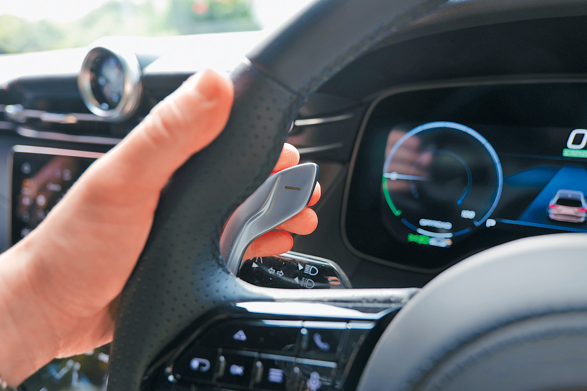 ▲軚盘后方+/-拨片用来调节煞车能量回收拖力。