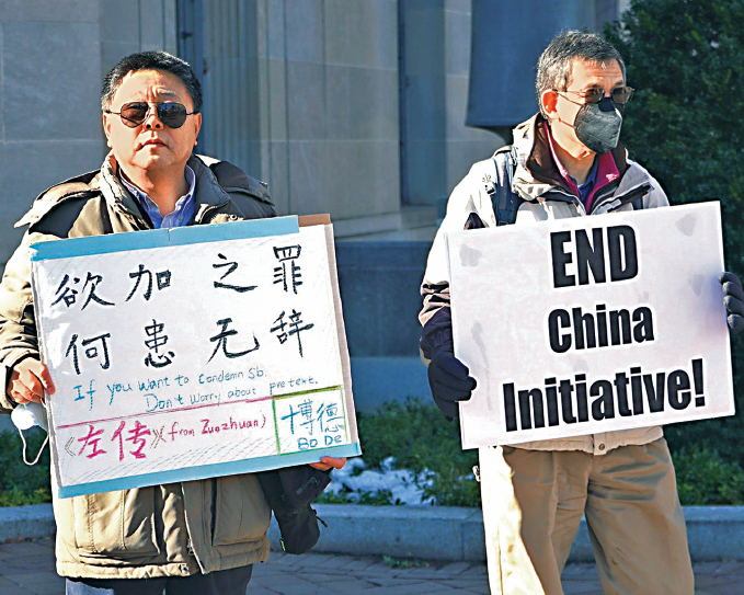 ▲华人在联邦司法部大楼抗议“中国行动计划”。