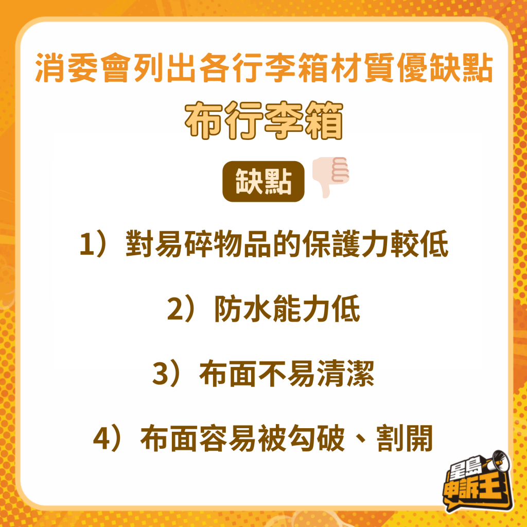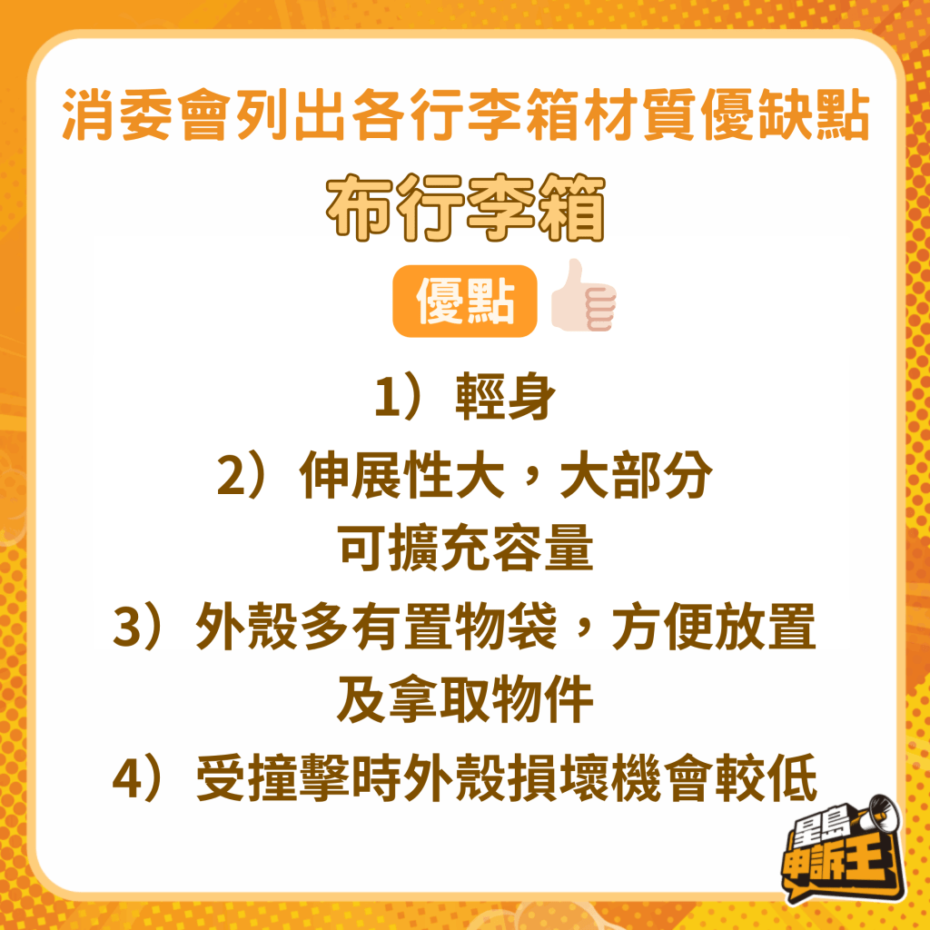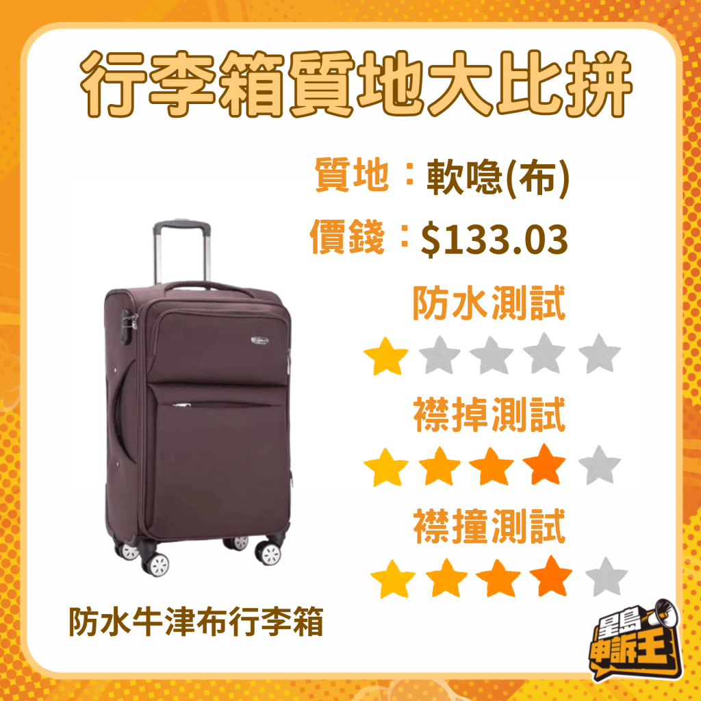 消委会回复《星岛申诉王》指,按其去年的测试结果,以塑胶制造的硬行李箱耐跌撞能力较高,布行李箱则需留意其车线位造工,若造工不佳便会在跌撞或挤压后有爆裂的风险。