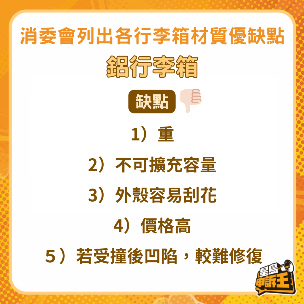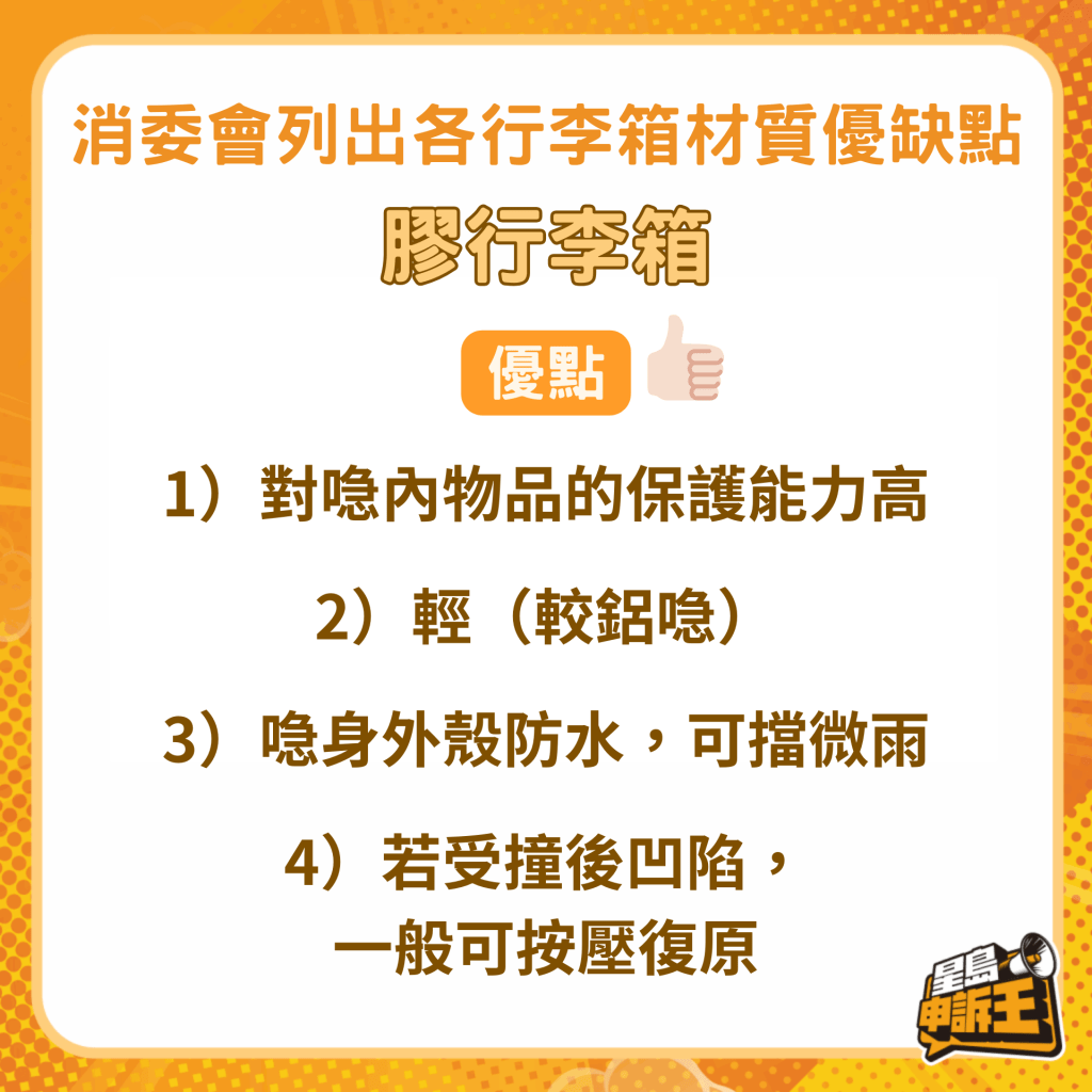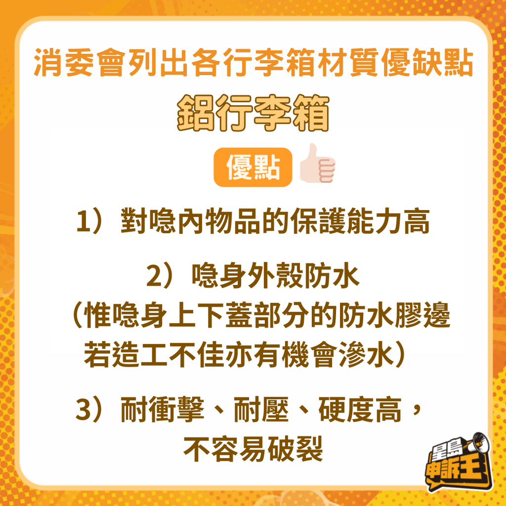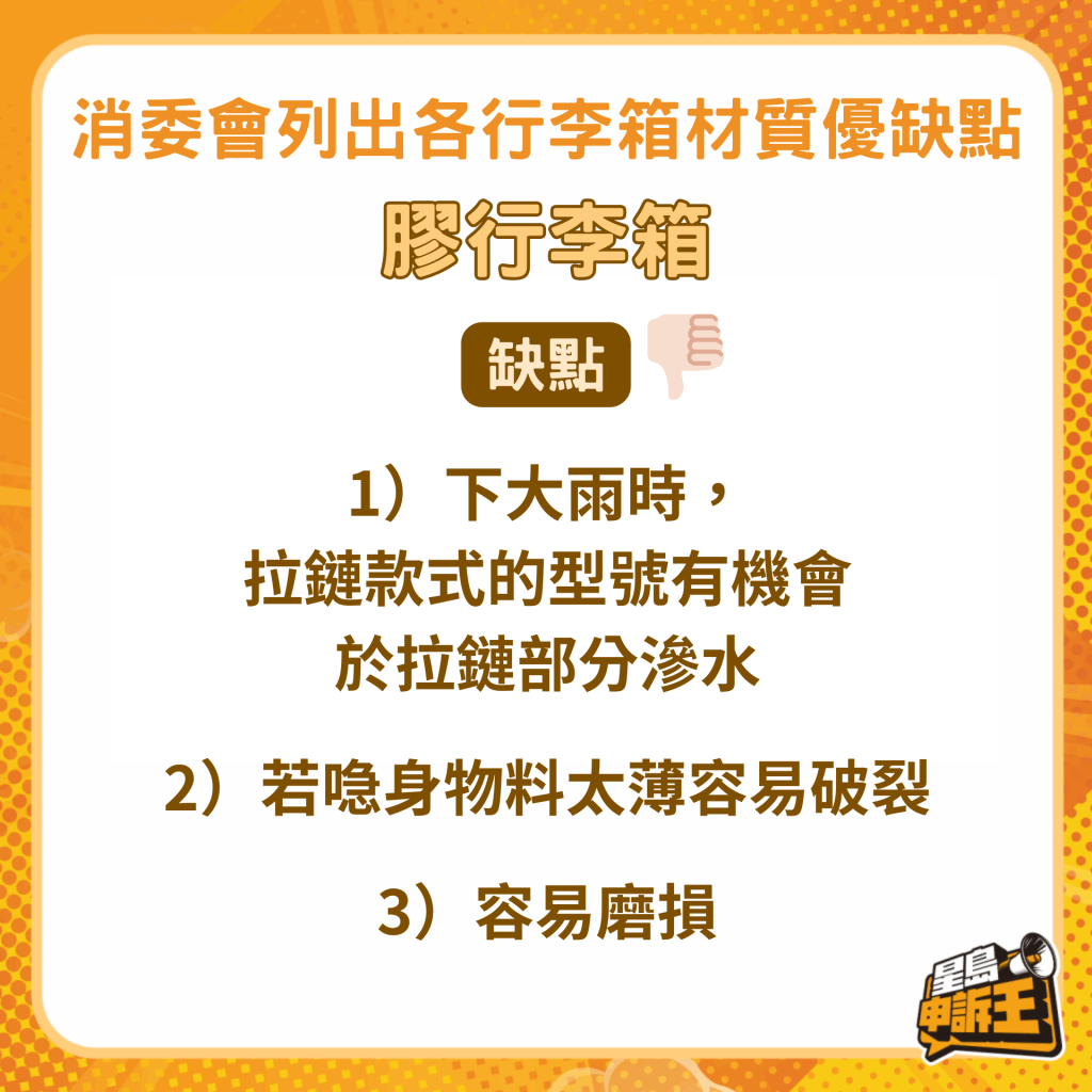 消委会回复《星岛申诉王》指,按其去年的测试结果,以塑胶制造的硬行李箱耐跌撞能力较高,布行李箱则需留意其车线位造工,若造工不佳便会在跌撞或挤压后有爆裂的风险。