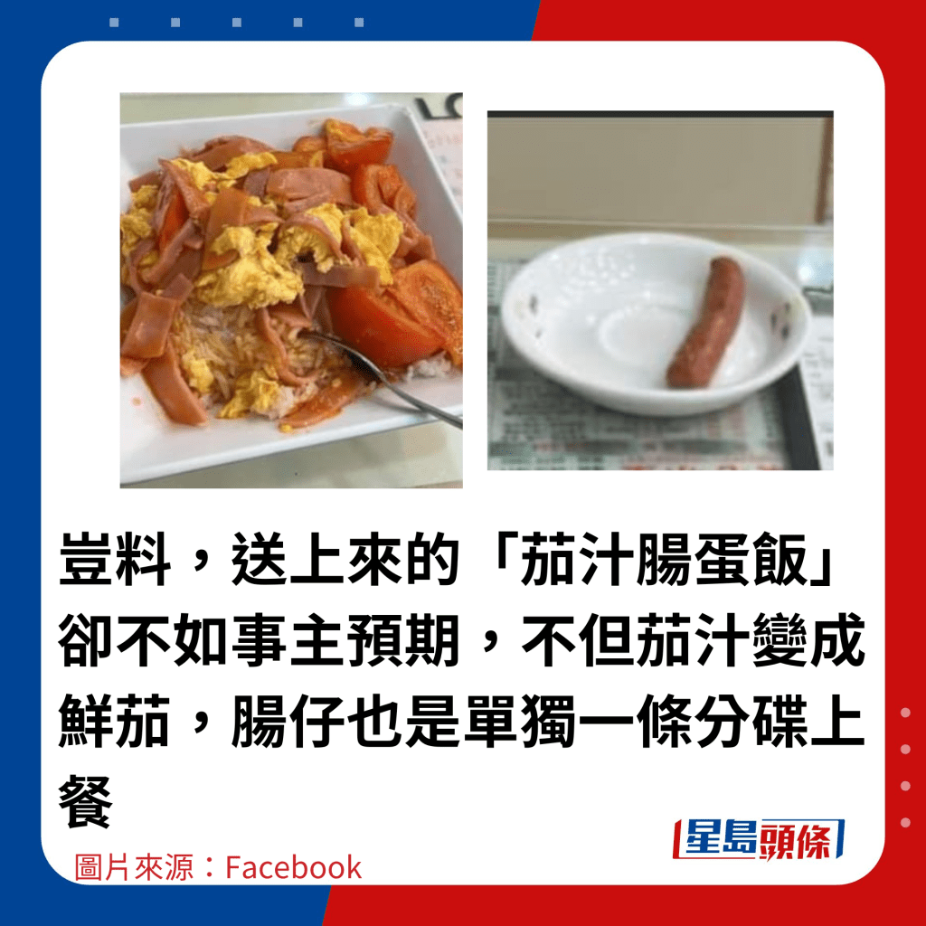 近日,有网民在Facebook群组“香港茶餐厅及美食关注组”中发文,分享自己光顾铜锣湾茶记时的惨痛经历。事主表示,自己本想点一份茄汁肠蛋饭,惟餐厅并无这个选项,但店员却指事主可以“散叫”,事主于是点了一份“茄汁肠蛋饭”。