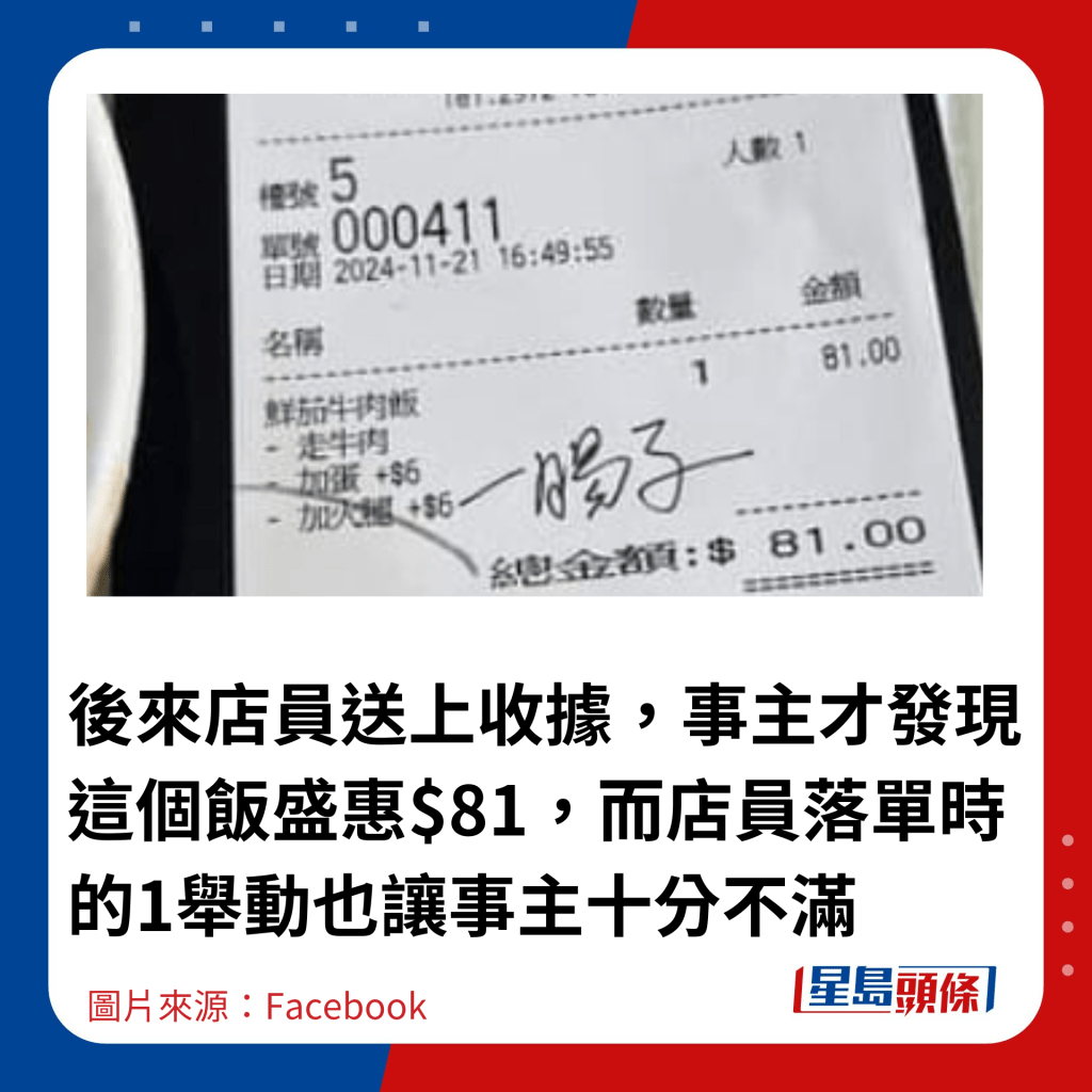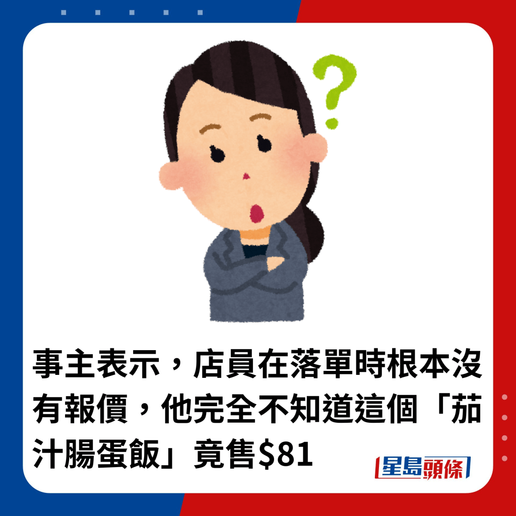 岂料,送上来的“茄汁肠蛋饭”却不似预期,不但茄汁变成鲜茄,肠仔也是单独一条分碟上餐。后来店员送上收据,事主才发现这个饭盛惠$81,而店员下单时的1举动也让事主十分不满,详情可点击上文图辑。
