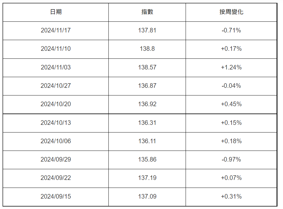 CCL继续处于逾8年低位,在2016年9月底水平徘徊,2024年楼价暂时累跌6.39%。指数较2021年8月191.34点历史高位跌27.98%,较2024年3月撤辣前的低位143.02点跌3.64%。11月19日元朗洪水桥滙都II公布首张价单81伙,11月23日北角101 Kings Road首轮推售157伙,对本地二手楼价的影响将于12月中旬公布的CCL才开始反映。