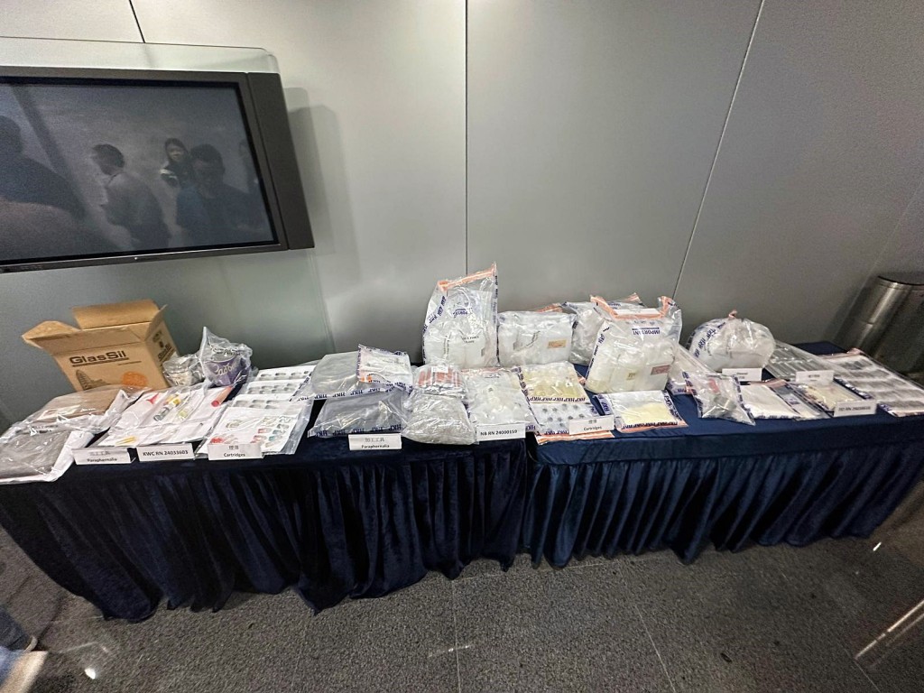 最后一宗是,昨晚约9时,警方在葵涌展开打击毒品行动,在葵盛西邨截查一名形迹可疑男子,其手持的一个纸箱内,搜出约1.67公斤怀疑“依托咪酯”粉末及其他工具。
