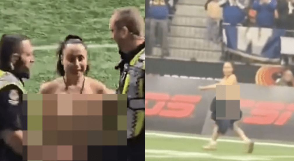 加拿大最盛大体育赛事格雷杯(Grey Cup)榄球赛周日(17日)举行冠军赛,未料却发生一段令人“大开眼界”小插曲。一名女子在中场休息期间突然一丝不挂跑进球场,还一度跌倒,裸出的身体在全场观众面前展露无遗。然而,整个过程竟然没有保安上前阻止,有关单位的处理引起质疑,有网民直问:保安是不想打断吗?