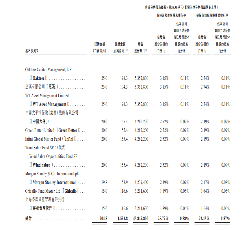 基石投资者包括:信和置业(083)全资附属惠汉、中国太保(2601)、小米(1810)旗下子公司Green Better、Oaktree、WT Asset Management、Infini、Wind Sabre、Morgan Stanley、Ghisallo及睿郡资产管理。