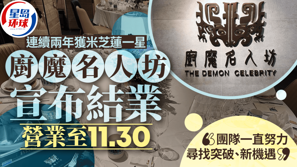 香港食肆结业潮持续,位于中环云咸街的米芝莲一星餐厅“厨魔名人坊”(The Demon Celebrity)宣布结业,下周六(11月30日)为最后营业日。“厨魔名人坊”在社交专页指,团队一直努力寻找突破,寻找新的机遇,当中包括另觅新铺址,新的环境,为“厨魔名人坊”揭开崭新一页。