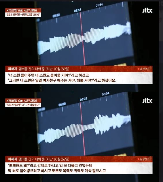 节目又公开了该成员与队友的对话录音,内容透露她遭到事务所老板性骚扰。该成员表示自己向老板提出退团,老板就对她说:“如果我帮你实现愿望,那你也要实现我的愿望。我希望你做我的一日女友,你愿意吗?”之后哭诉被对方强吻、试图用舌头侵犯,还有摸胸、摸屁股等恶行,过程长达2小时,令她情绪崩溃,决定将受害一事告诉父母。