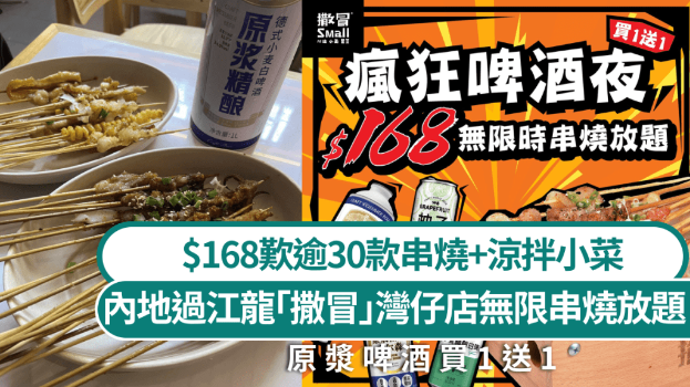 内地的烧烤串烧放题深受不少港人欢迎,近年更有内地过江龙餐厅来港“插旗”开分店,当中包括川菜品牌“撒冒”!“撒冒”主打重庆小面和成都冒菜,早前逆市连开湾仔及将军澳2间分店,日前更在湾仔店推出内地人气极高的无限时串烧放题,$168起就歎到30款串烧及凉拌小菜,更有原浆啤酒买1送1优惠,即看下文了解详情!