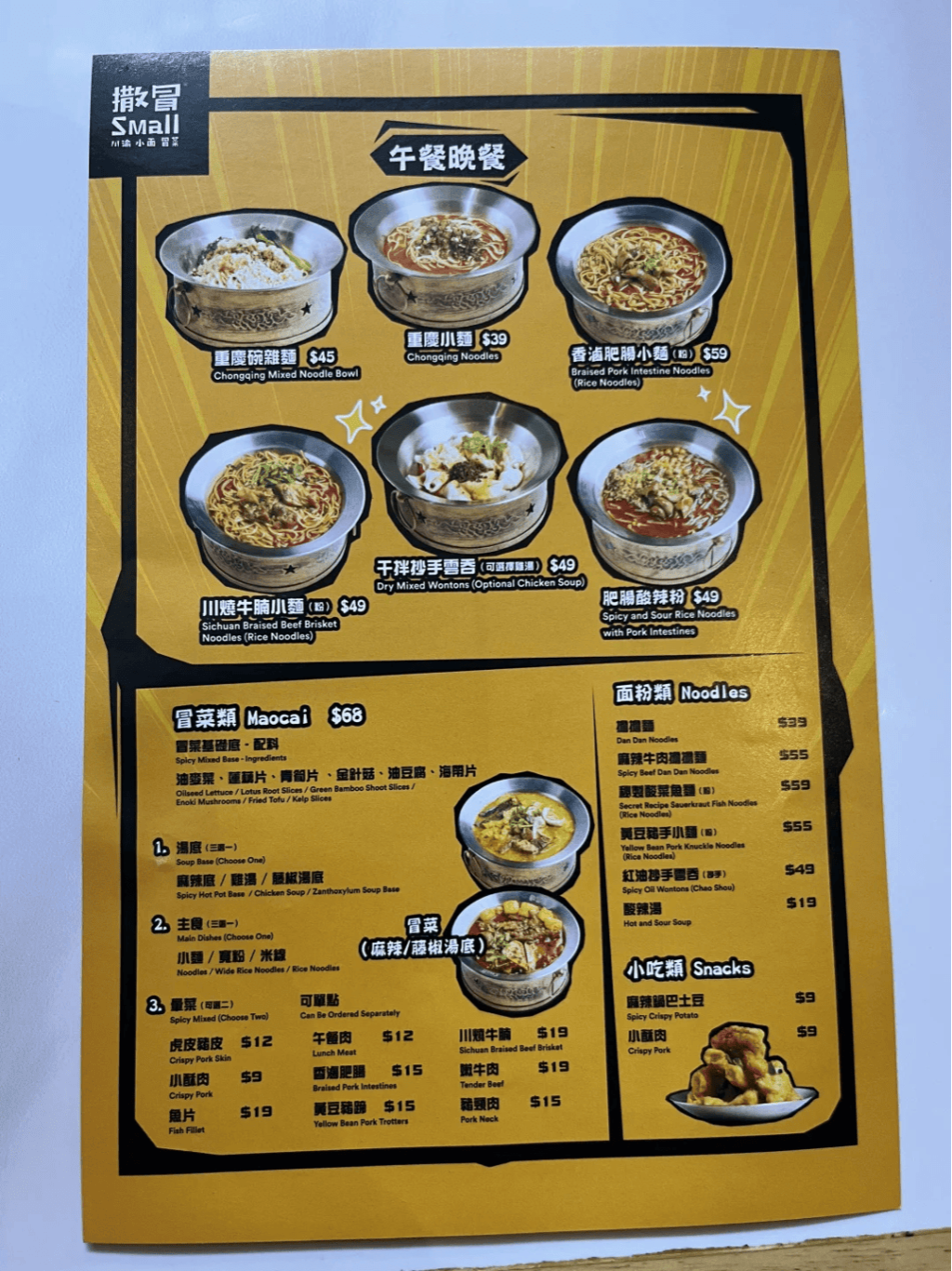 “撒冒”的招牌乾拌面售价由$39起,款式包括泡椒猪肝拌麵、蒲烧鳗鱼拌麵及重庆豌杂麵等,当中部分食材更是由成都直送,并由当地主厨监修出品。另一主打冒菜系列,则提供4款汤底,包括麻辣、藤椒、金汤酸辣及鹿茸鸡汤底,更有超过20款材料选择,如巴掌肥牛、嫩牛肉、虎皮凤爪、香滷肥肠等。