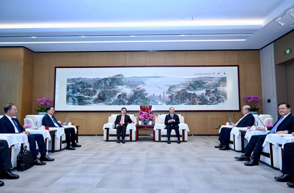 ▲黄坤明、王伟中与李家超、郑雁雄率领的香港工商界代表团举行工作会见。