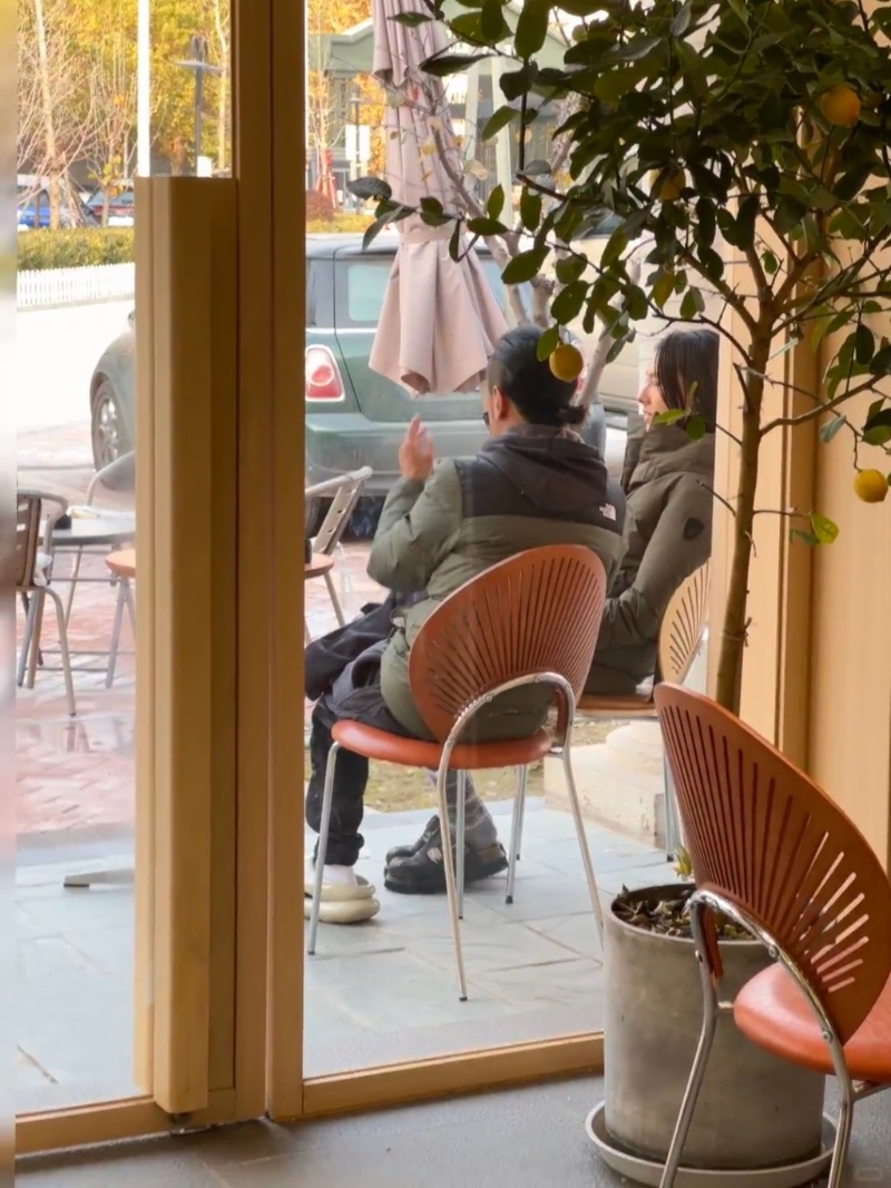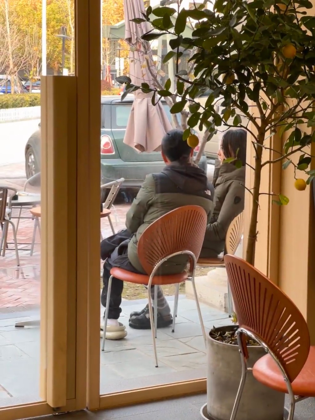▲梁洛施与马浴柯均穿着军绿色羽绒,二人坐在店外的椅子上闲聊。