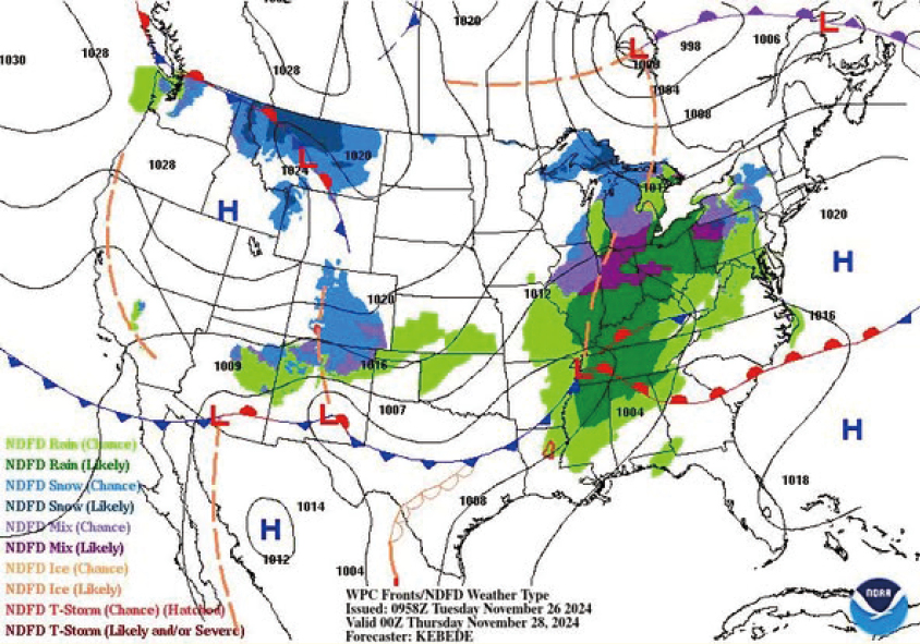 感恩节当天,除东部地区之外,美国大部分地区的天气将是干燥和寒冷的。NOAA预计28日将会有降雨,打算参加和观看纽约市梅西百货感恩节大游行的民众可能需带上雨伞。NOAA表示,风寒将使北部平原和中西部地区的气温低于零度,从密歇根州半岛北部到纽约州西部可能会出现湖泊效应降雪,意味着在黑色星期五血拼的民众需冒着低温出去购物。从平原到五大湖地区,气温预计将比平均值低15至25度。