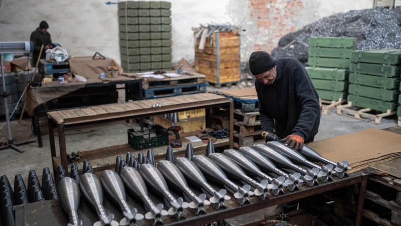 ▲工人在乌克兰一间工厂内组装迫击炮弹。 美联社