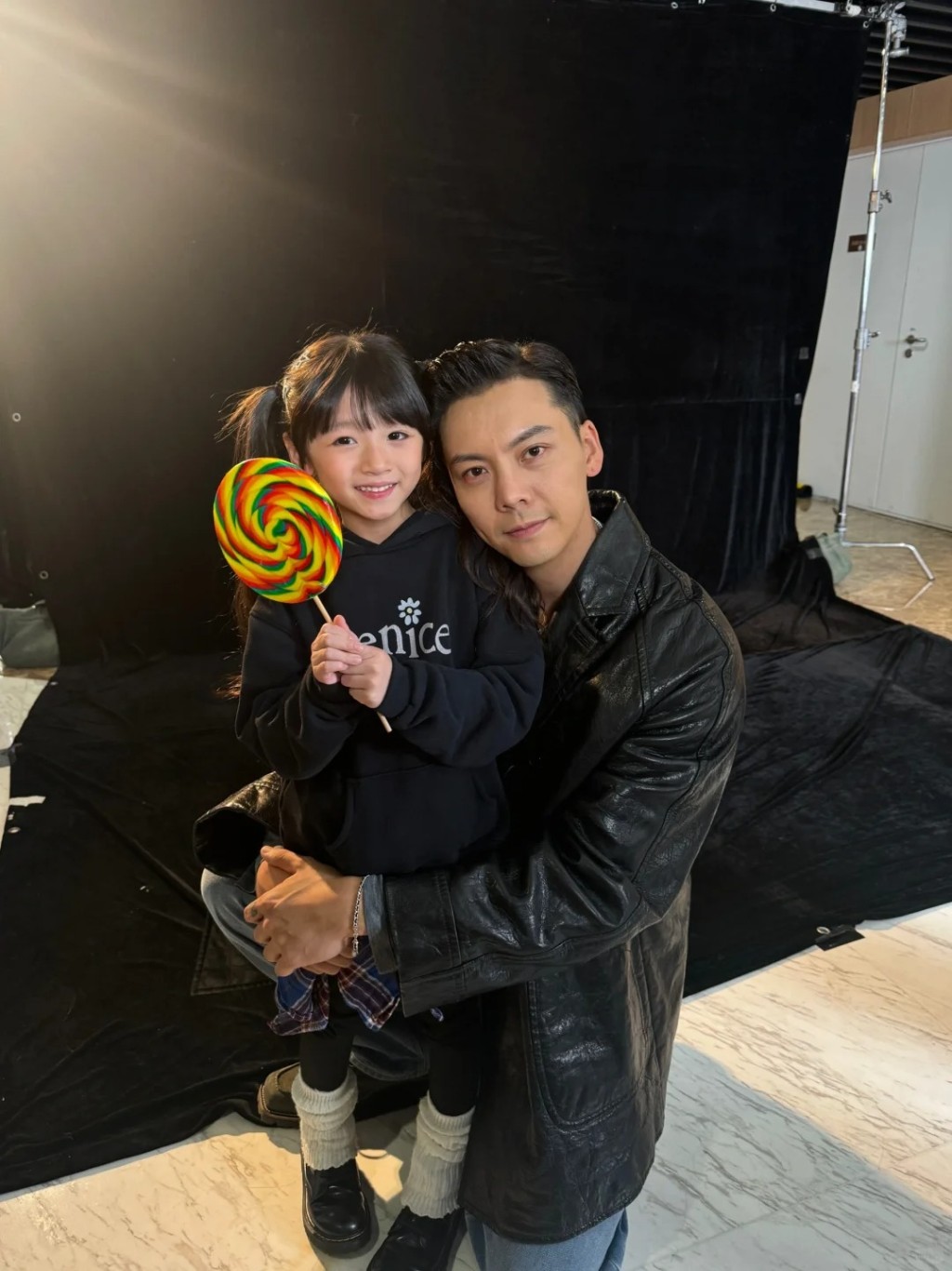 最近,有网民在小红书上分享与陈伟霆的合照,并留言:“来找我的伟霆爸爸了,终于见到伟霆爸爸了,说了生日快乐还画了卡,太开心了”。 照片中的陈伟霆穿上黑色亮面皮衣及牛仔裤,单膝跪地兼双手环抱着怀中的小女孩,并将头靠近对方,画面相当温馨。