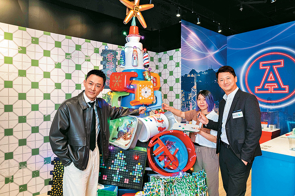 ▲(左起)林峯与香港展能艺术会艺术家赵惠芝及昂坪360董事总经理董沛铨,一同以回收的红A旧物拼砌成崭新的圣诞艺术装置。