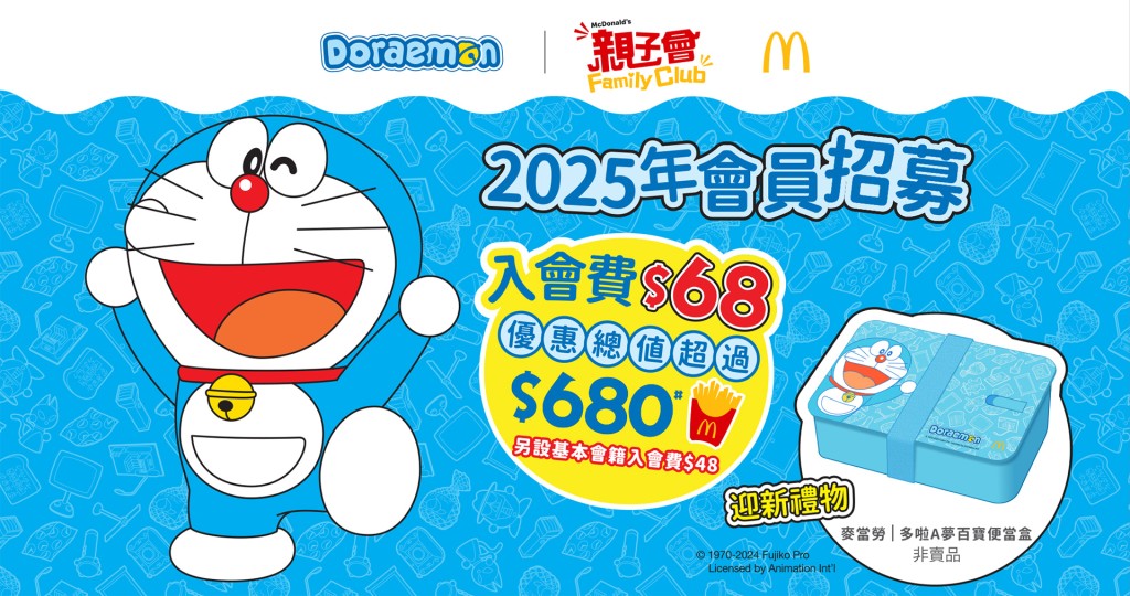 ▲麦当劳亲子会2025开始登记!入会费$68即享逾$680礼遇 联乘多啦A梦推出限量迎新礼物“多啦 A 梦百宝便当盒”11月28日上午10时起登记