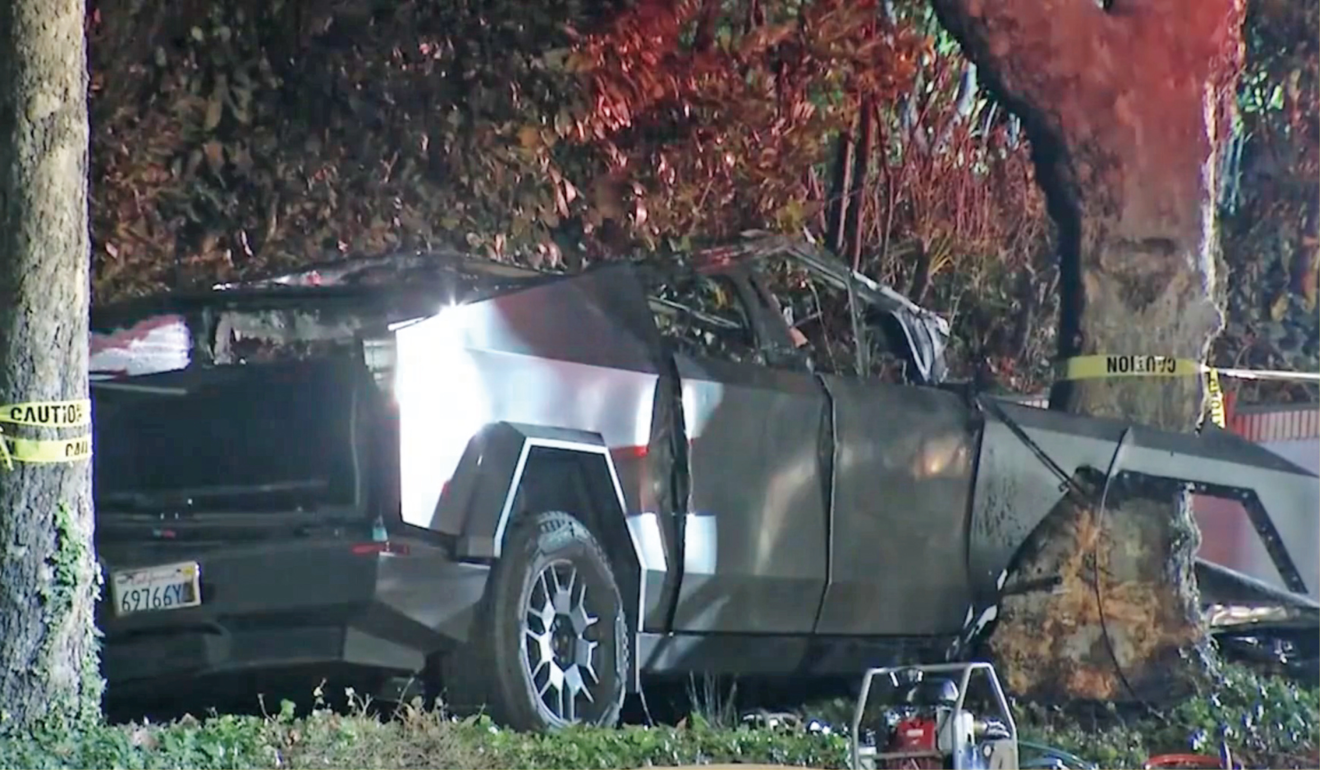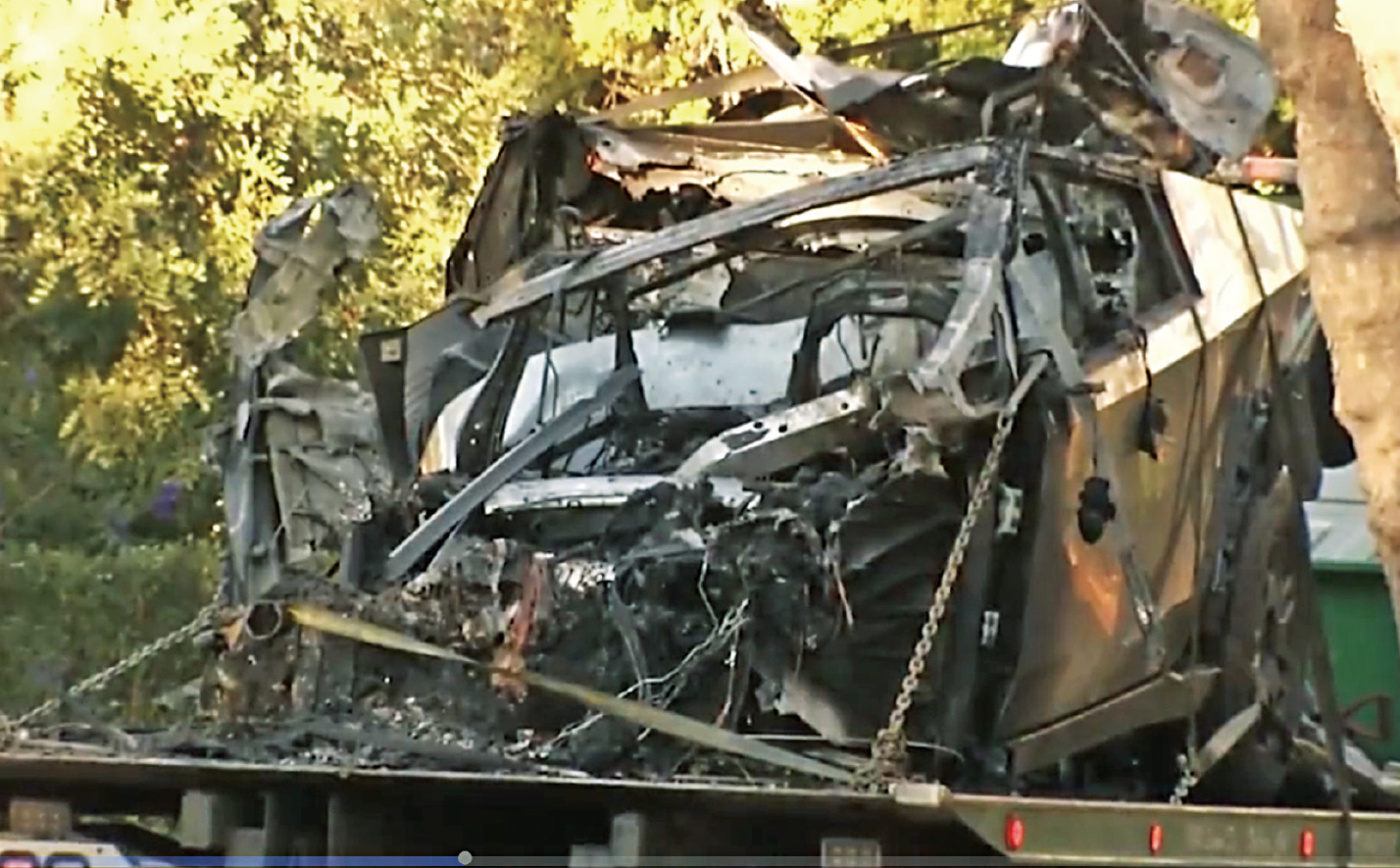 ▲Cybertruck撞树全毁,造成三死一伤。据指车上四人都是高中同学及朋友,皆从大学回湾区度假却发生惨剧。KTVU/KRON4电视画面