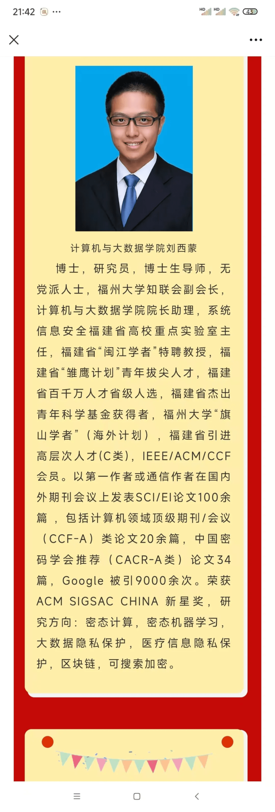 据了解,福州大学有一位男博士,研究员名为刘西蒙,是福建省“闽江学者”特聘教授,福州大学“旗山学者”(海外计划),福建省引进高层次人才(C类),IEEE/ACM/CCF会员,现任福州大学计算机(计算机)与大数据学院教授、博士生导师,网络系统信息安全福建省高校重点实验室主任等职。