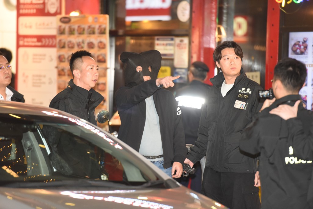 ▲被捕的陈惠良戴上头套、双手锁上手铐、腰缠铁链,今日被押解到尖沙咀重组案情。