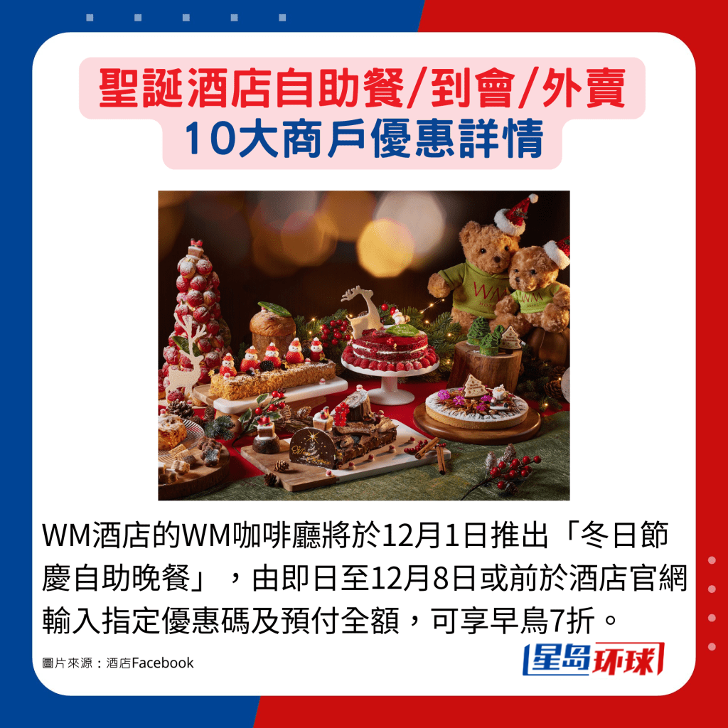 若想到酒店豪叹美食共度佳节,不妨先了解各大人气酒店的节日菜式,抓紧各种优惠,对号入座。位于西贡WM酒店的WM咖啡厅,将于12月1日推出“冬日节庆自助晚餐”,包罗圣诞烤火鸡、烤美国安格斯牛肉眼、红酒炖和牛舌及节日甜品等美食,现凡于12月8日或前于酒店官网预订,并输入指定优惠码及预付全额,即可享7折。