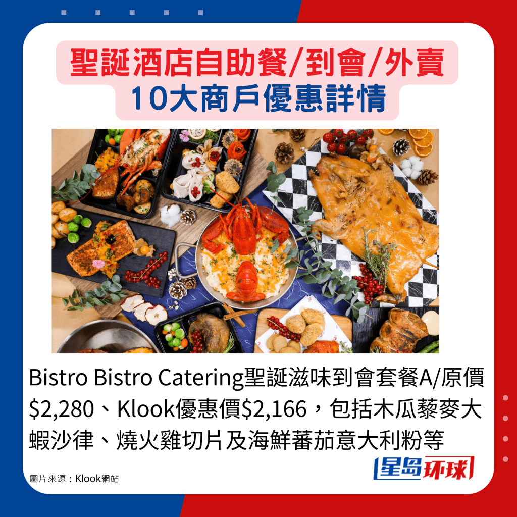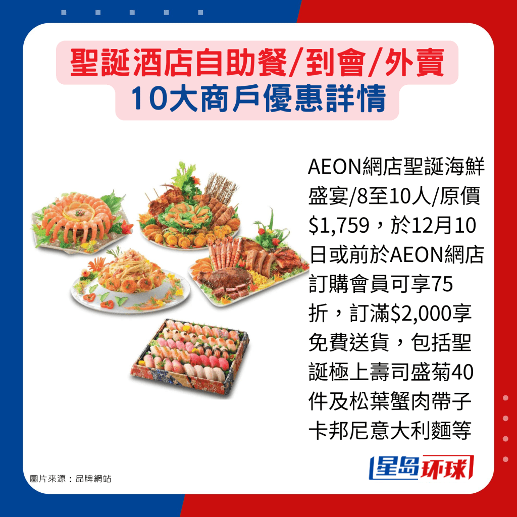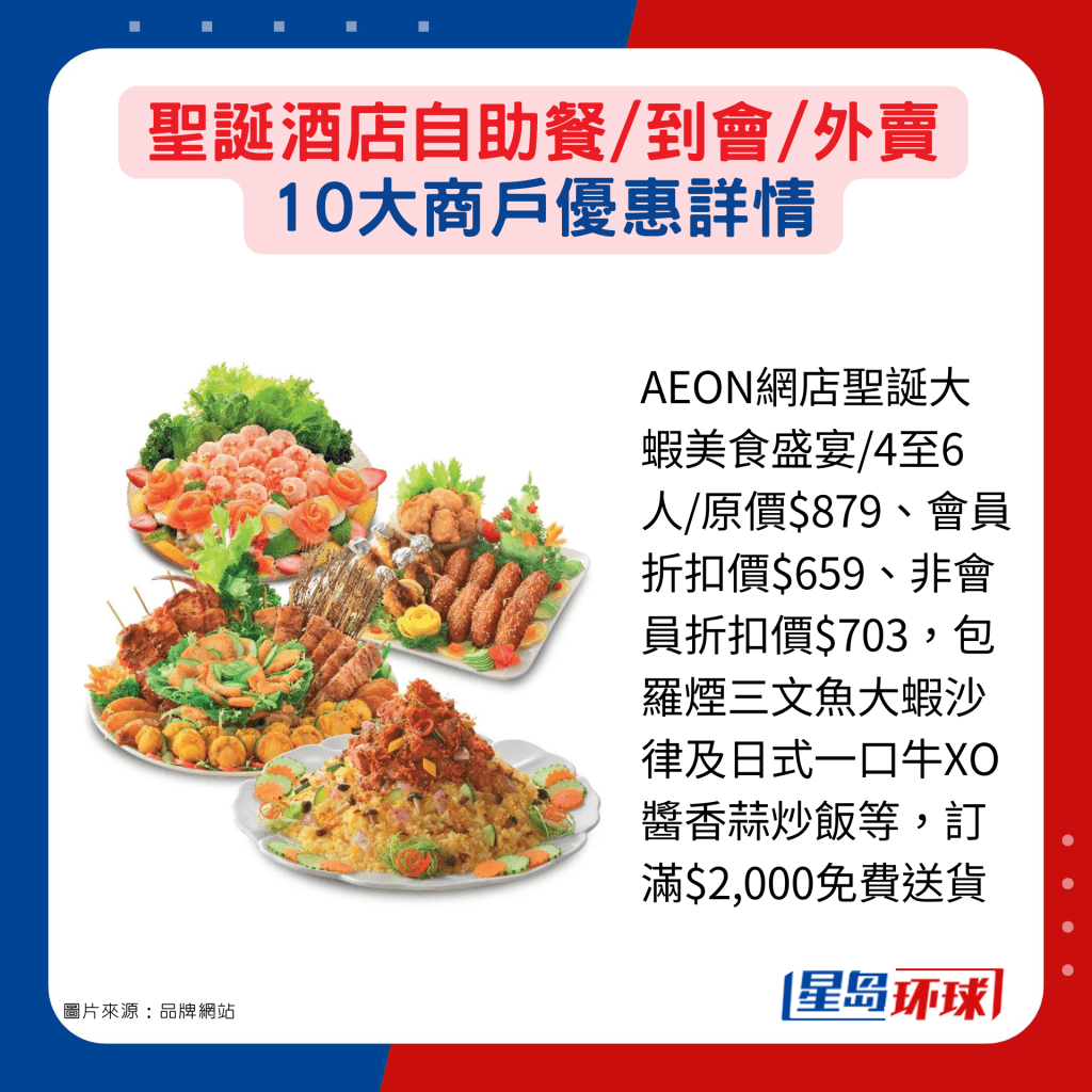 在旅游平台Klook上,亦可找到圣诞到会套餐优惠,好像Bistro Bistro Catering圣诞滋味到会套餐A,包括木瓜藜麦大虾沙律及烧火鸡切片等,原价$2,280,现售$2,166。另于12月10日或前,在AEON网店订购圣诞烤鸡盛宴套餐及圣诞海鲜盛宴套餐,均有8折优惠,会员更享75折,买满$2,000免运费。