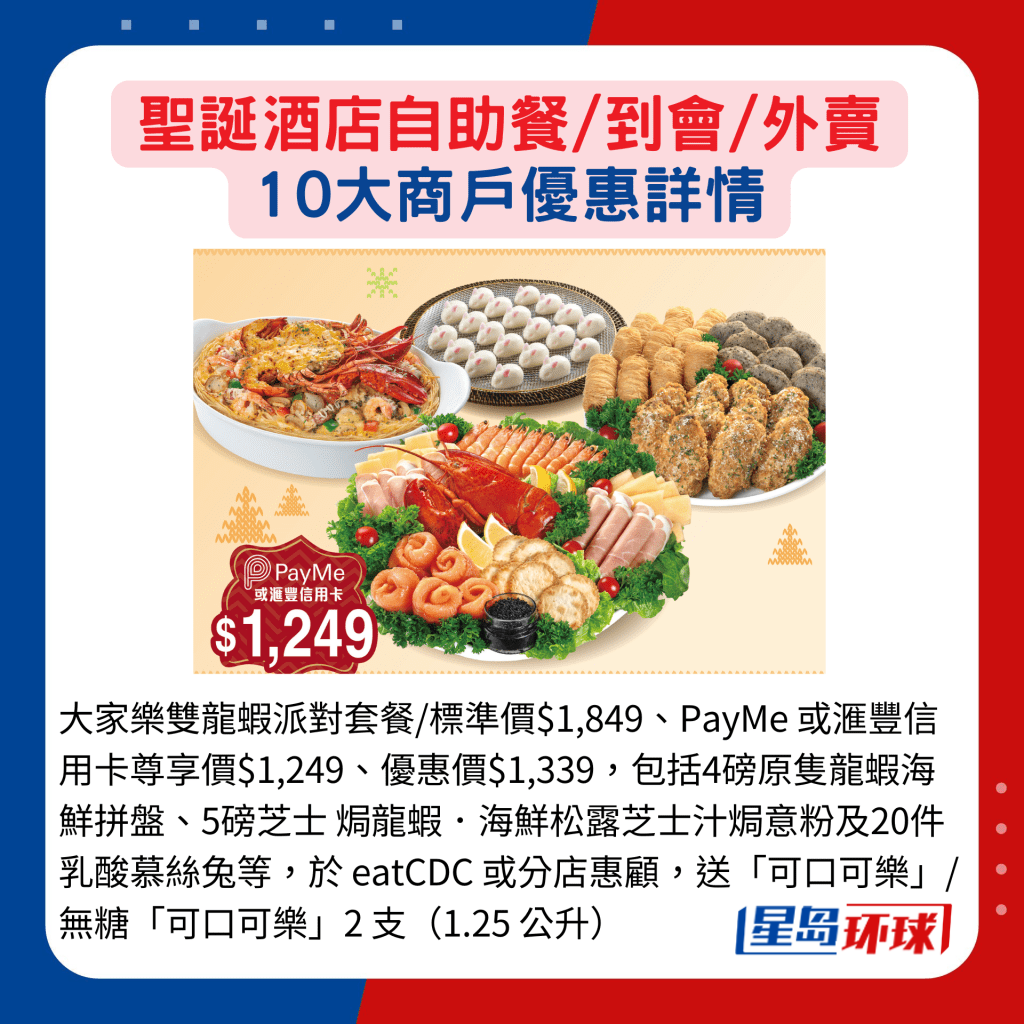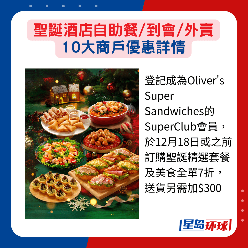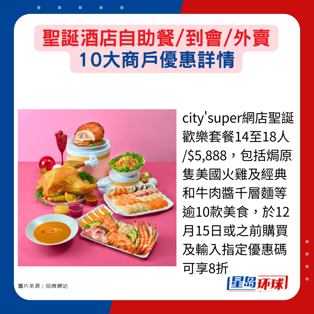 在旅游平台Klook上,亦可找到圣诞到会套餐优惠,好像Bistro Bistro Catering圣诞滋味到会套餐A,包括木瓜藜麦大虾沙律及烧火鸡切片等,原价$2,280,现售$2,166。另于12月10日或前,在AEON网店订购圣诞烤鸡盛宴套餐及圣诞海鲜盛宴套餐,均有8折优惠,会员更享75折,买满$2,000免运费。