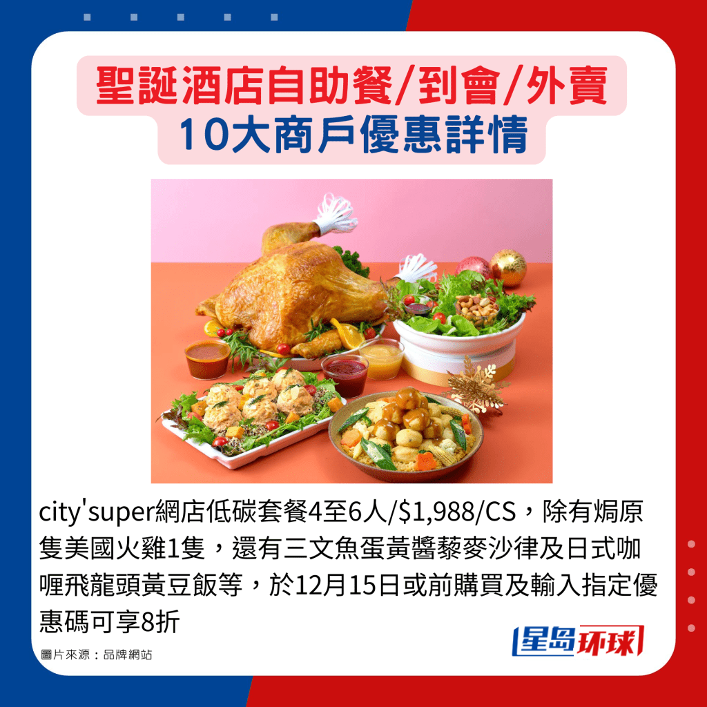 如果在家中、Party Room或会所开派对,最方便当然是选择到会或外卖。city'super网店推出多款专为圣诞节而设的套餐,其中适合4至6人的低碳套餐,包括焗原只美国火鸡之外,还有日式咖喱飞龙头黄豆饭及三文鱼蛋黄酱藜麦沙律等美食,最适合健康一族的口味。由即日至12月15日或前于网店订购,输入优惠码“EARLYBIRD20”可即享8折兼免运费。