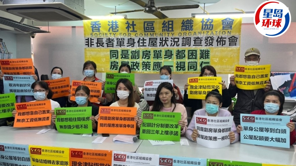 社区组织协会今日(1日)举行记者会,指目前政府很多政策未有包含非长者单身人士,该类人士不能申领现金津贴,甚至申请简约公屋,认为政府政策倾斜对家庭及长者,忽略非长者单身者,要求政府实时开放轮候公屋满3年的非长者单身可申请简约公屋,并改革公屋计分制; 有非长者单身的劏房户指,自己迟迟未能上楼,慨叹“单身是否一个罪呢?”促请政府善待非长者单身人士。