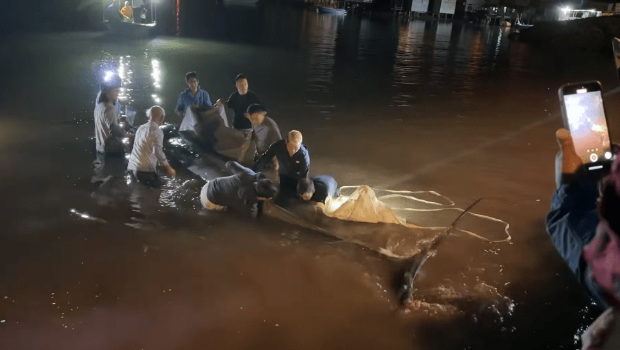 大澳周六(30日)有一条长约5至6米的鲸鱼搁浅,它在岸边对开一至两米的位置喷气挣扎,身上有多处正在流血的伤口,多名市民落海合力营救。香港海豚保育学会副会长麦希汶表示,猜测搁浅的是全世界最罕见的朗氏印太喙鲸,又指早上出海进行考察时,曾见它在大澳对开水域出没。