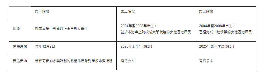 此次补种计划专为2004至2008年出生、未完成HPV疫苗接种的女性香港居民制定。每名合资格人士将可免费接种两剂疫苗,而免疫力较弱者则可免费接种三剂。分三个阶段进行,其具体安排如下: