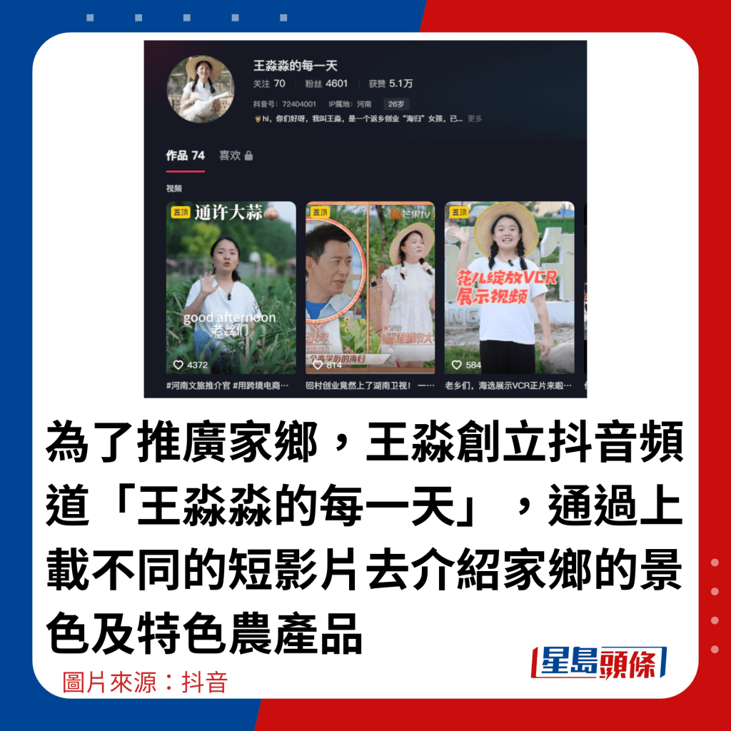 ▲为了推广家乡,王淼创立抖音频道“王淼淼的每一天”,通过上载不同的短影片去介绍家乡的景色及特色农产品。