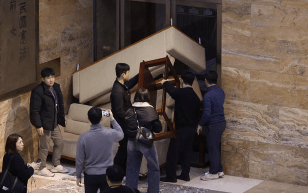 ▲国会议员以椅子挡住国会门户,阻戒严军进入。 路透社